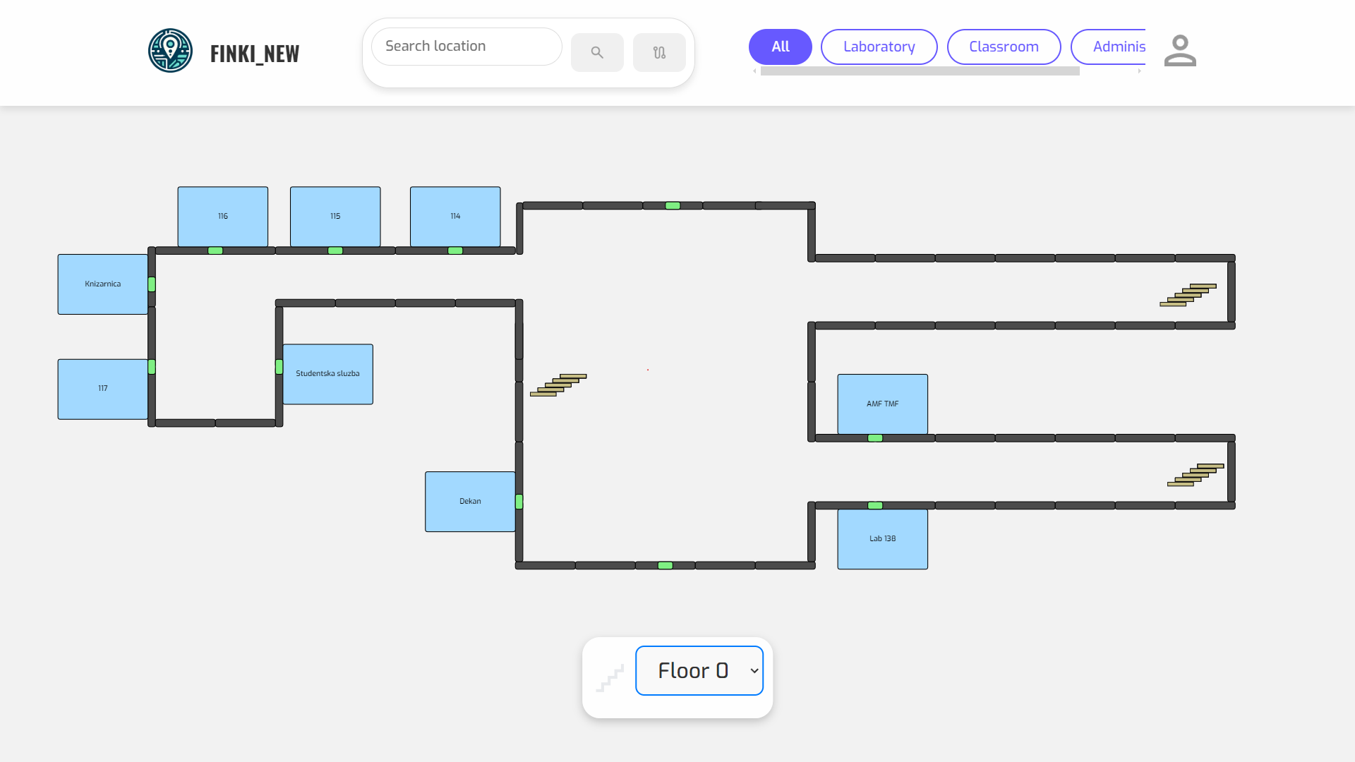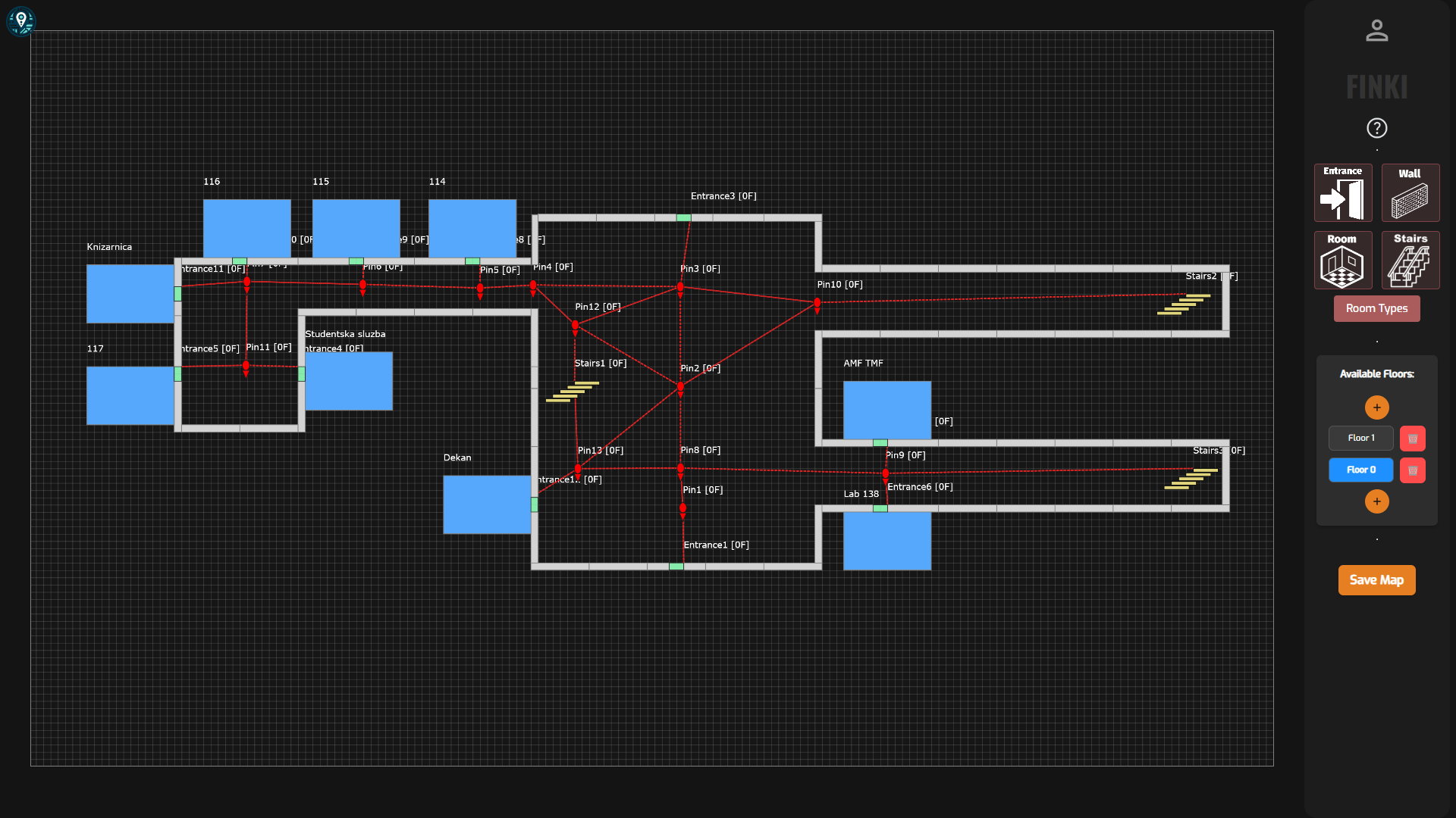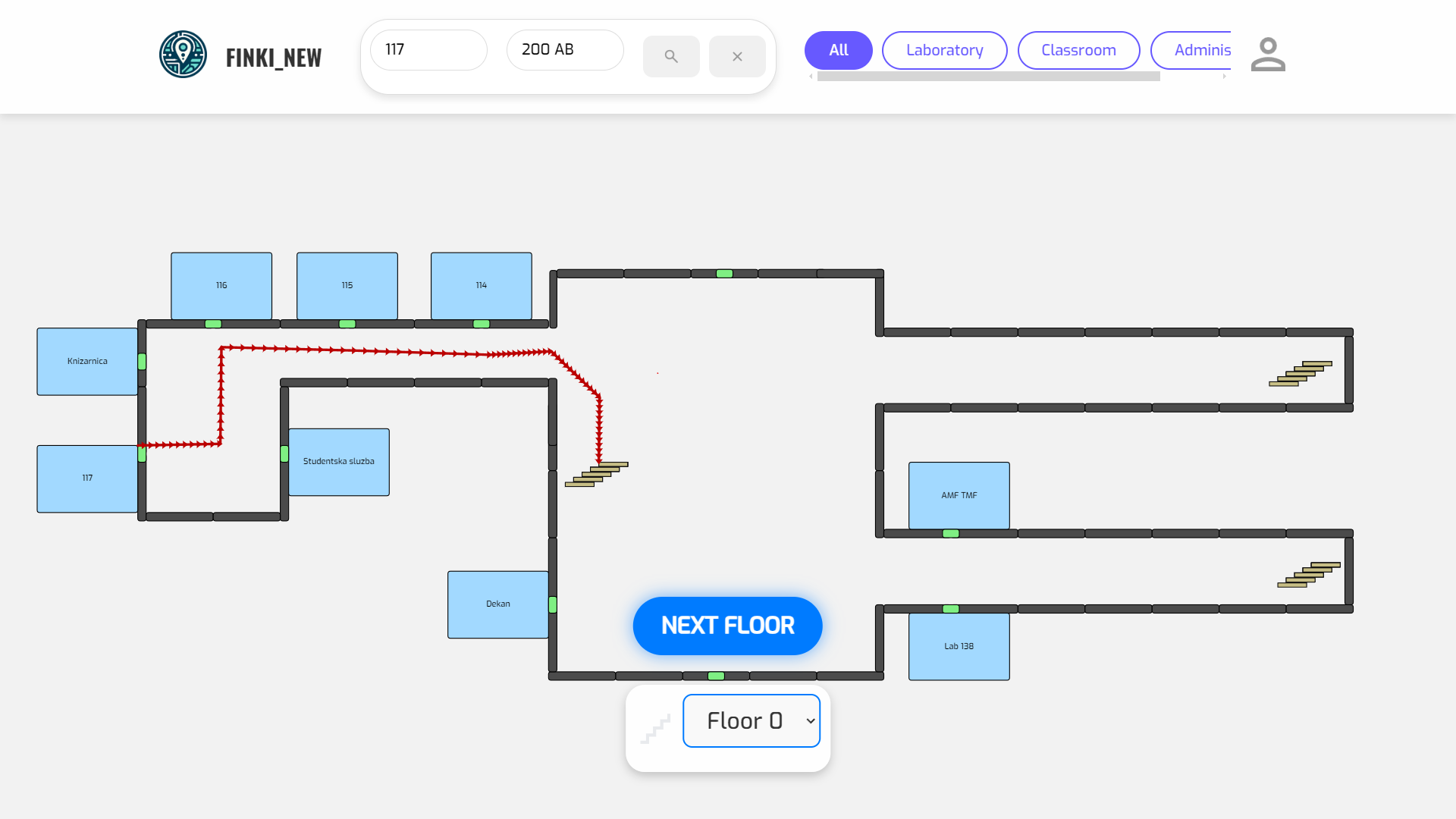 Доколку просторијата се наоѓа на друг кат, патеката запира кај скалите за тој кат и се појавува копче за пренасочување до следниот кат.