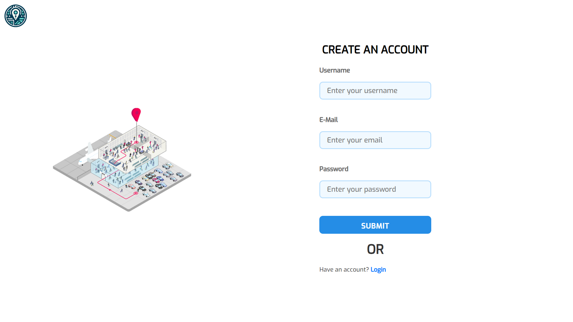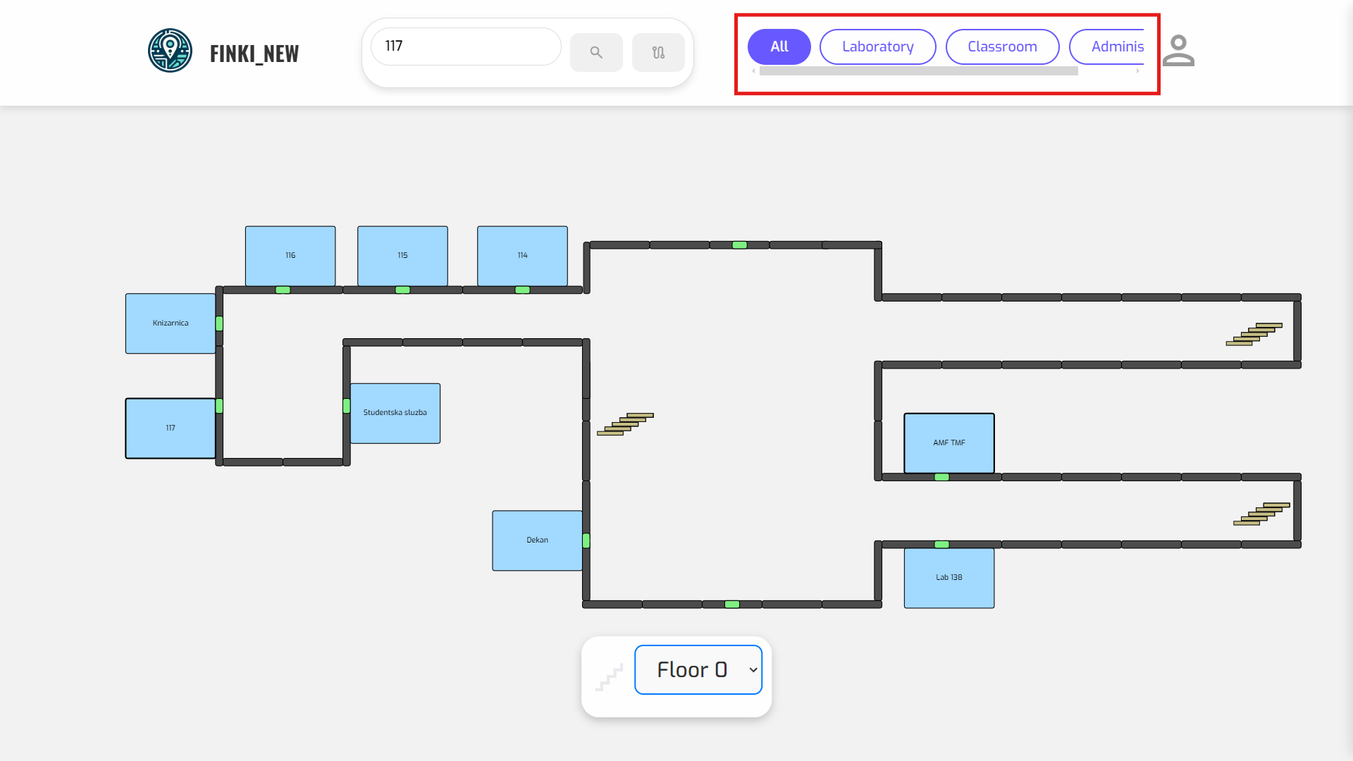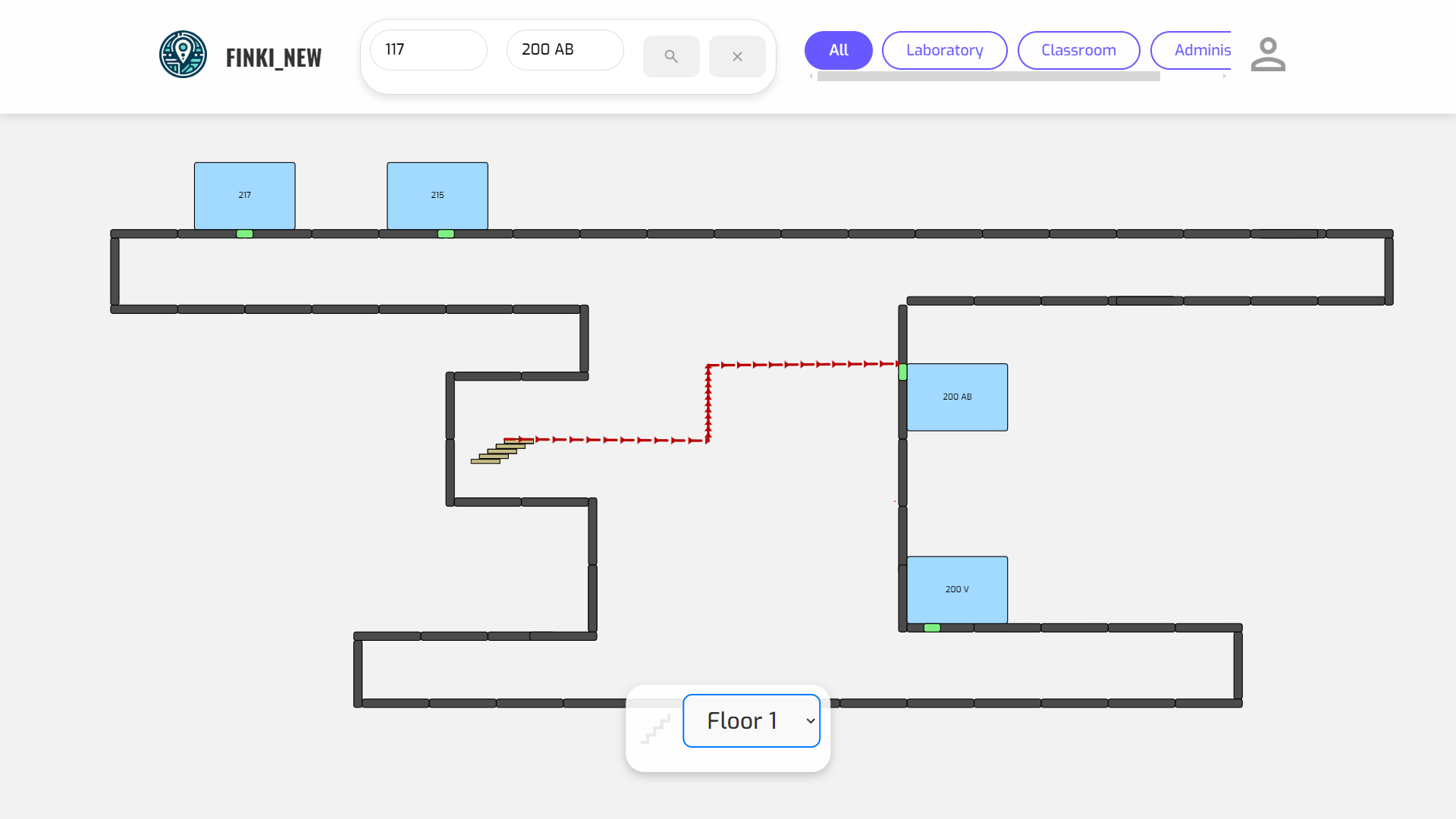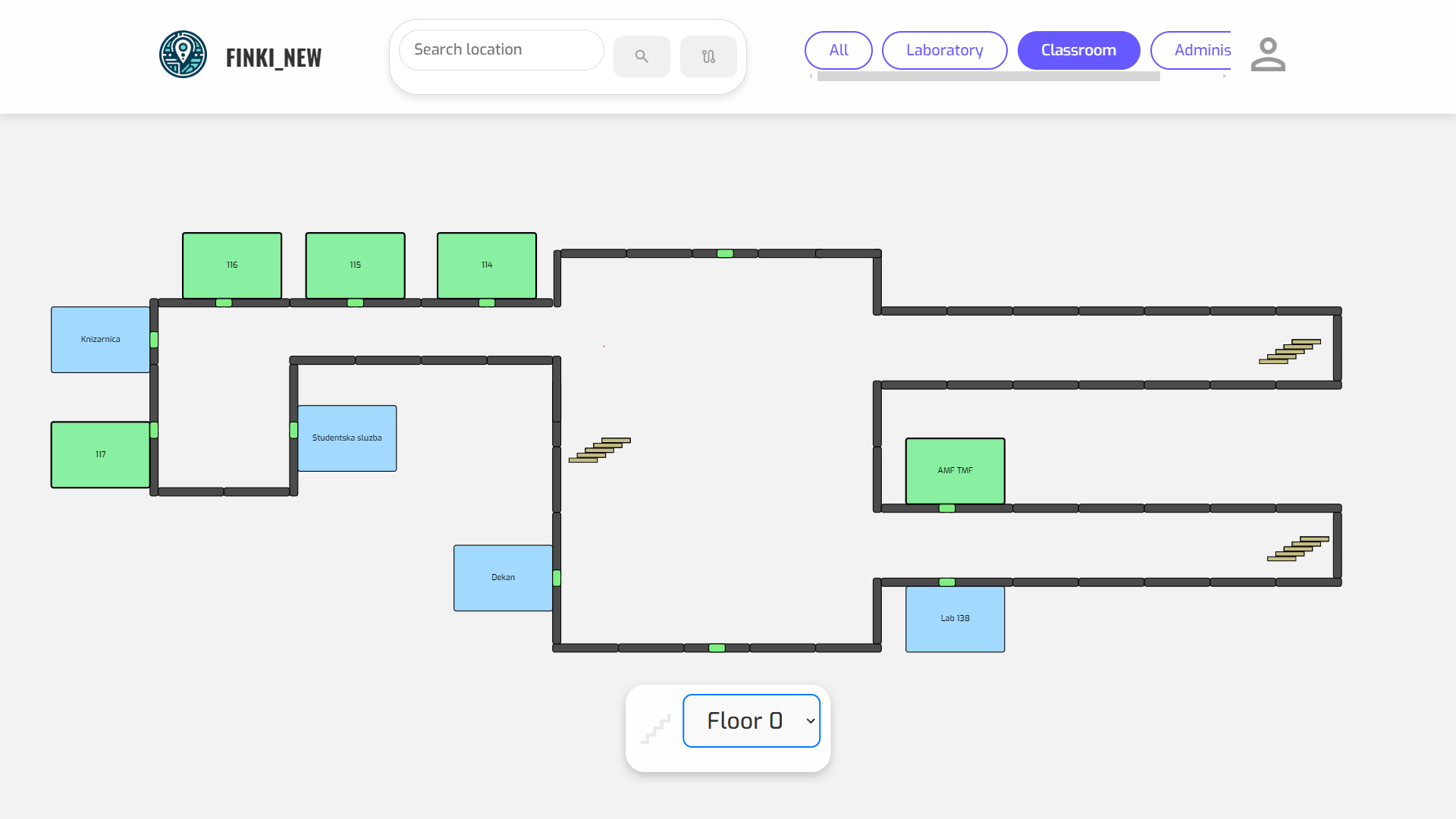 Доколку просторијата се наоѓа на друг кат, патеката запира кај скалите за тој кат и се појавува копче за пренасочување до следниот кат.