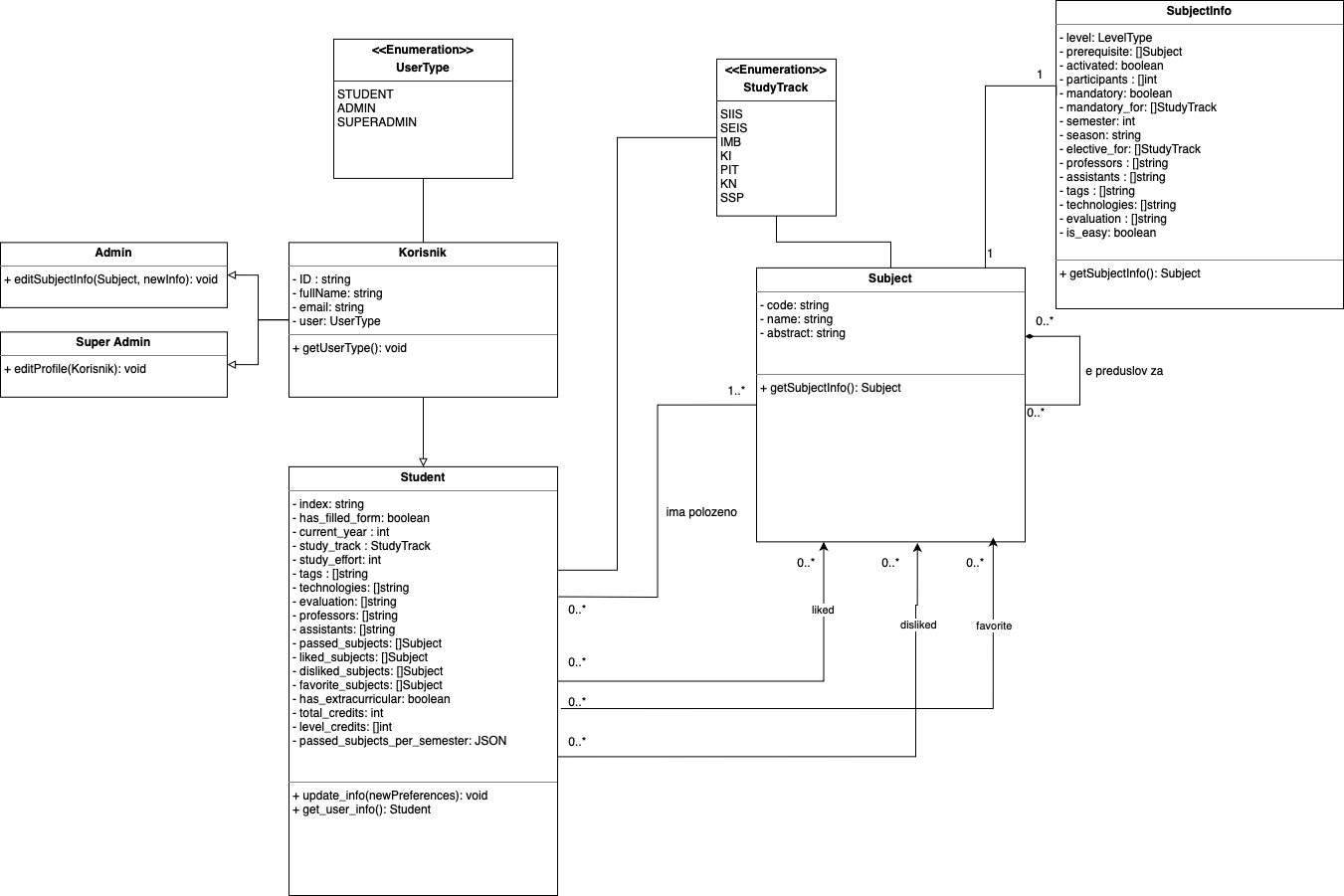 Развојниот дијаграм останува ист. Се користи React за frontend, Django за backend со Django ORM за полесно пристапување до база и PostgreSQL за базата на податоци. Во класниот дијаграм има некои промени како додавање/тргање на неколку атрибути и преименување на истите за конзистентност со постоечките модели.