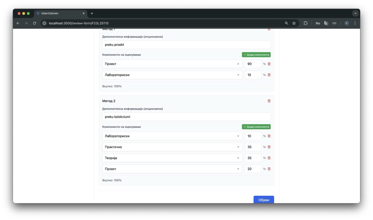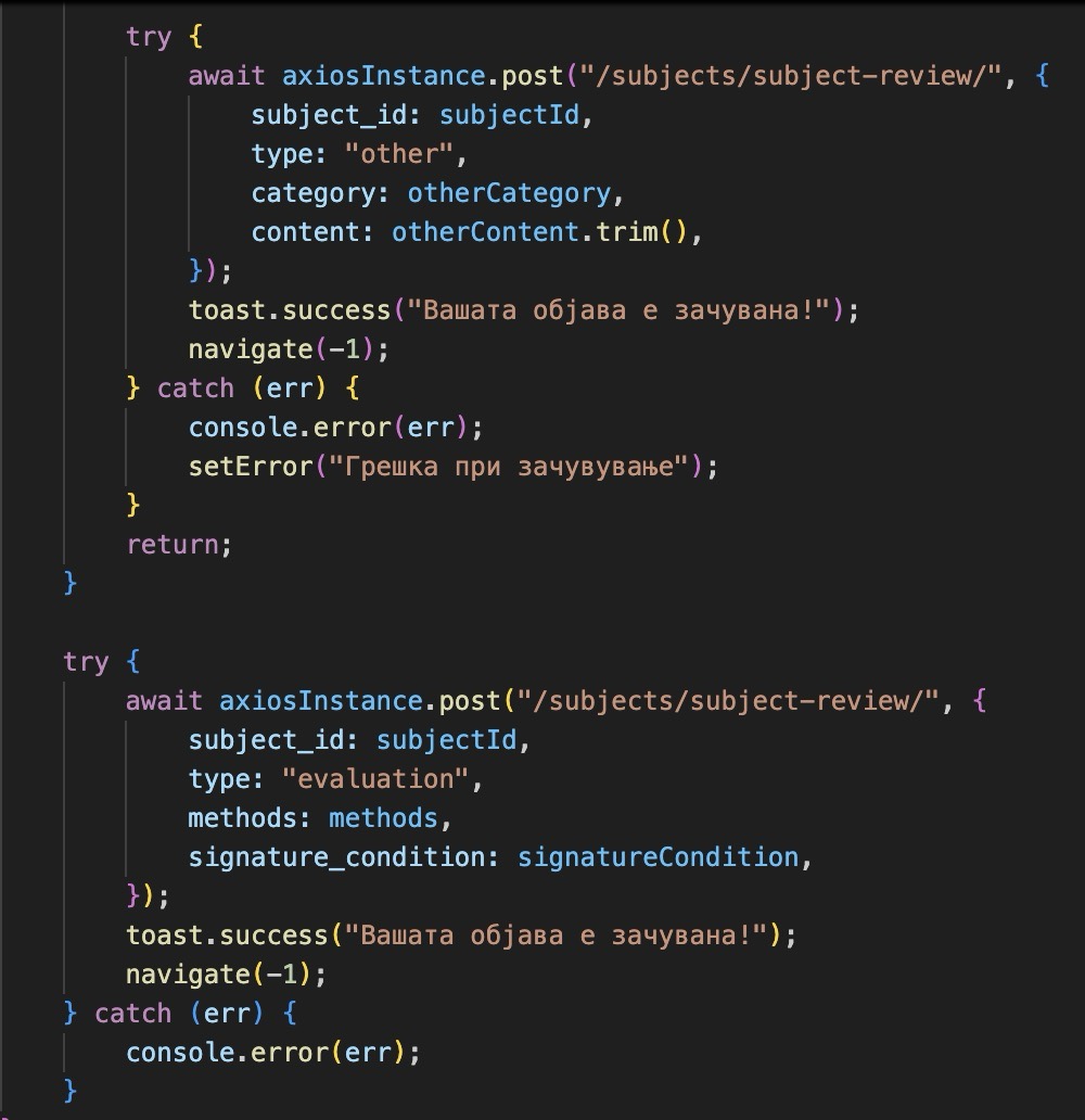 За двата типа со клик на копче се испраќа POST барање на истиот endpoint. Разликата е во содржината што се праќа и нејзиниот формат, согласно типот на информација која студентот ја споделува.