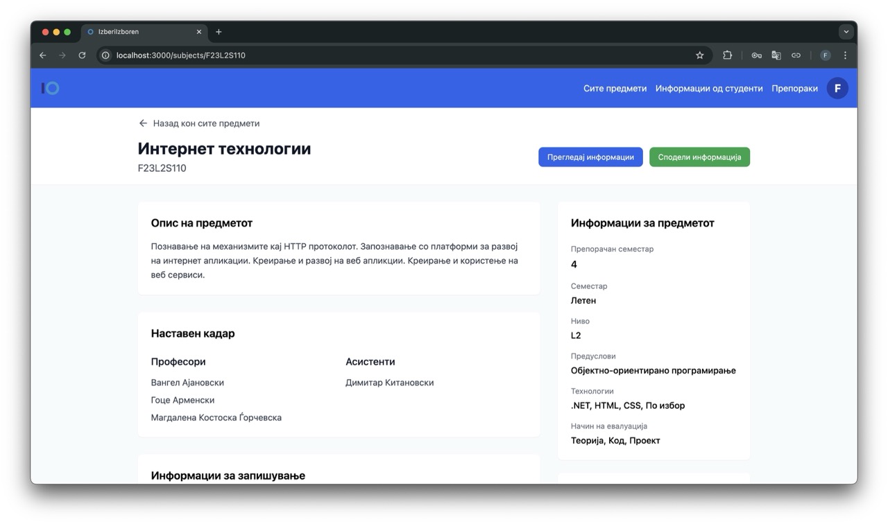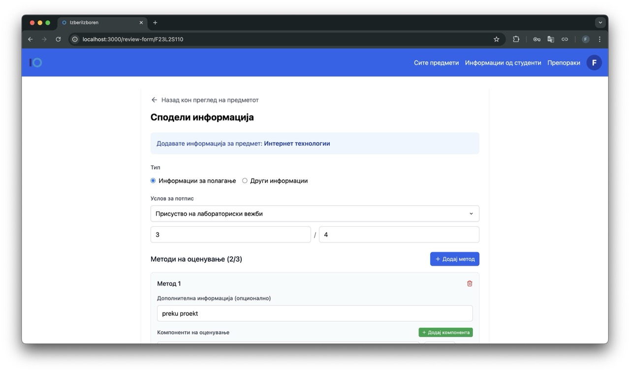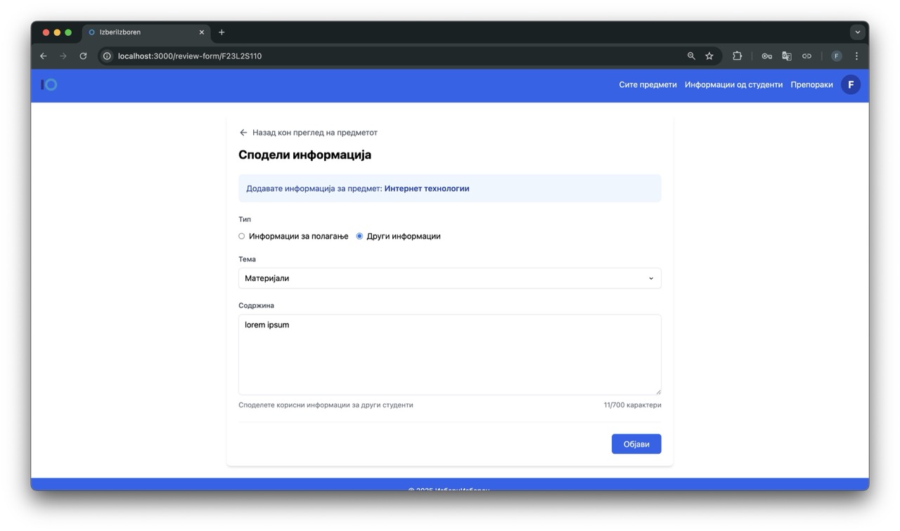 Откога ќе се навигира до одреден предмет, со кликање на копчето сподели информација се отвара форма каде студентот може да пополни 2 типа на информации.