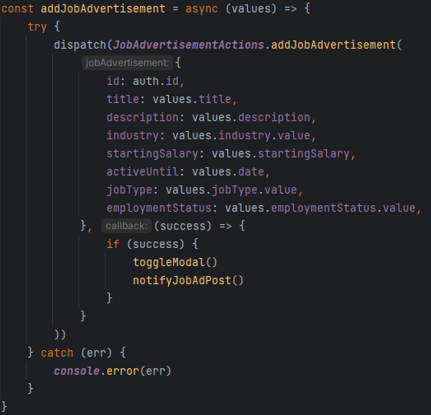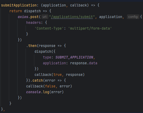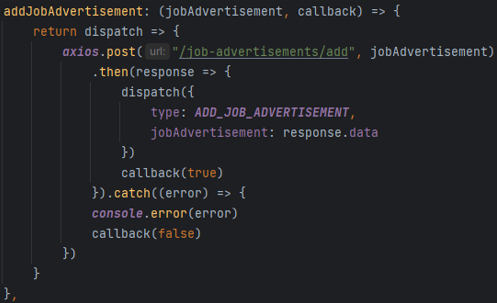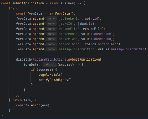 При клик на копчето, се повикува функција која испраќа POST request до backend апликацијата, во кој се сместени одговорите на прашањата од апликацијата, CV фајлот, id од самиот корисник, како и id од самиот оглас.