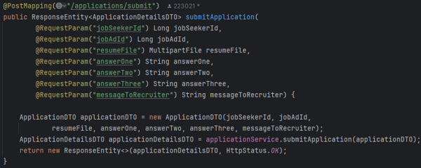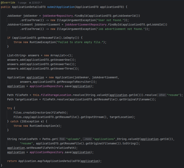 Методот кој што се повикува од сервисот ги наоѓа корисникот и огласот според испратените идентификатори. Потоа креира објект со податоците од апликацијата, пронајдениот корисник и пронајдениот оглас и преку repository-то го зачувува во датабазата. Со ова, на апликацијата и се доделува уникатно id кое се користи за дефинирање на патеката каде што ќе биде зачуван самиот CV фајл. По нејзино дефинирање, фајлот се зачувува на соодветната патека, а во самиот објект на апликацијата се зачувува релативната патека од овој фајл. Оваа функција назад го враќа објекот измапиран во друга класа, кој што се проследува до контролерот а потоа назад до frontend апликацијата каде директно се зачувува во state-от за испратени апликации од самиот корисник.