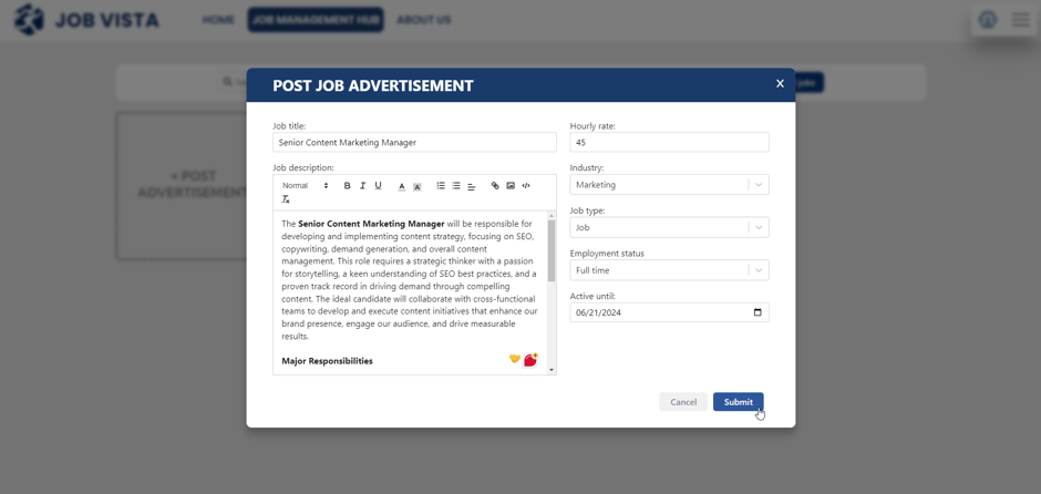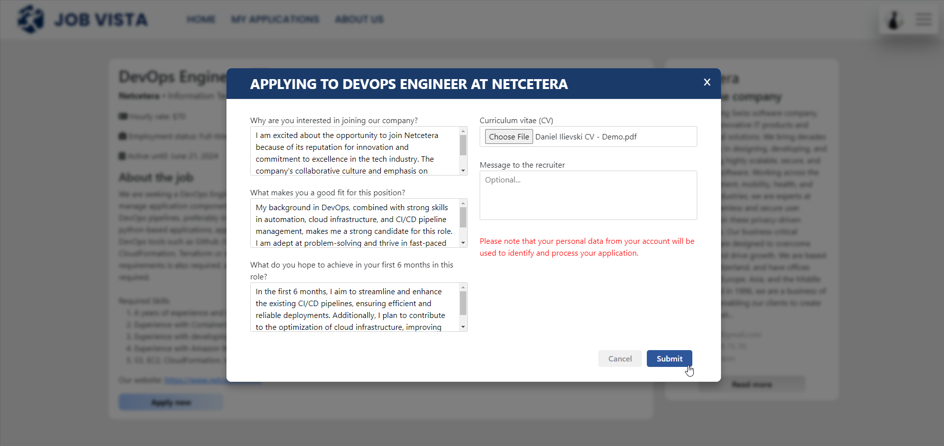 За аплицирање на оглас за работа, корисникот тоа го прави со притискање на копчето „Submit“.