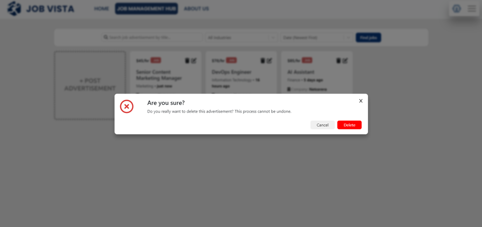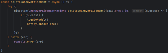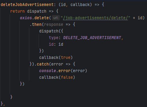 Процедурата за бришење на оглас не е ништо поразлична од претходните две, освен тоа што се испраќа DELETE request, каде id-то на огласот кој сакаме да го избришеме е сместен директно во URL-то.