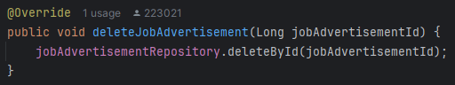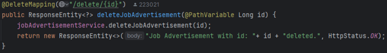 Во сервисот се повикува функција каде преку repository-то дирекно го бришеме огласот со соодветното id од датабазата.