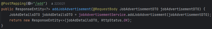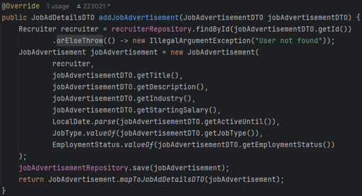 Методот кој што се повикува од сервисот го наоѓа корисникот со соодветното id, креира објект со деталите и пронајдениот корисник и преку repository-то го зачувува во датабазата, а назад го враќа објекот измапиран во друга класа, кој што се проследува до контролерот а потоа назад до frontend апликацијата каде директно се зачувува во state-от за огласи