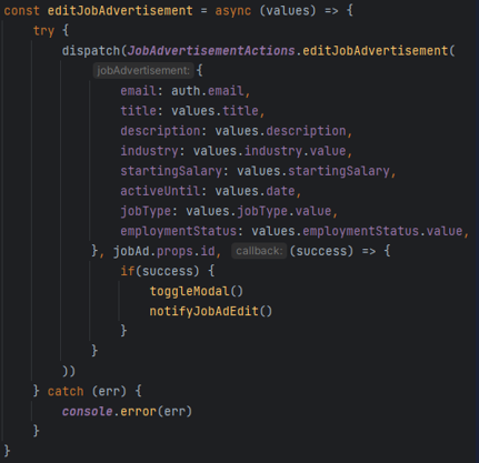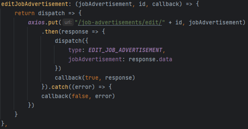 Слична е и процедурата за ажурирање на оглас каде при клик на копчето „Save changes“ се повикува функција која испраќа PUT request до backend апликацијата, кој за разлика од претходниот request, дополнително се испраќа и id-то од самиот оглас директно сместено во URL-то.