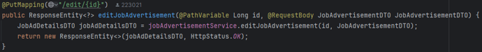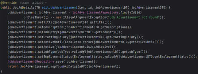 Во сервисот се повикува соодветна функција каде прво се наоѓа огласот преку id-то, преку set функции се изменуваат податоците и преку repository-то се зачувува огласот променет во датабазата. Дополнително назад кон контролерот се испраќа објекот измапиран во друга класа, а потоа назад до front-end апликацијата каде повторно се зачувува во state-от за огласи.