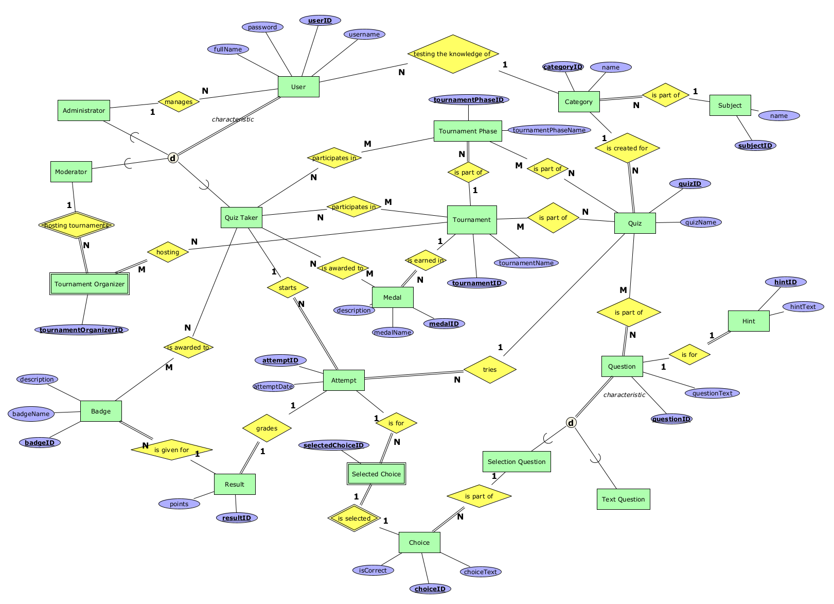 - participates in - N:N релација помеѓу Quiz Taker и Tournament која опишува дека еден решавач може да учествува на повеќе турнири, а на еден турнир може да учествуваат повеќе решавачи.