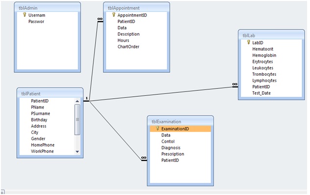 The database is consisted of 4+1 tables: tblPatients, tblExaminatin, tblLab, tblAppointment and also table of login.