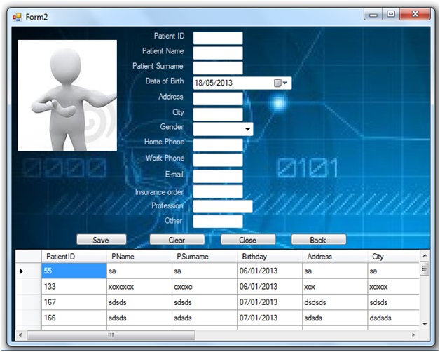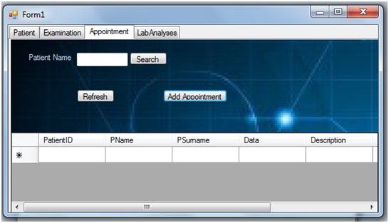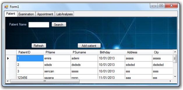 This form is the first step of all other forms because in this form the patient is saving with all information and if the user won’t to search the patient information it can be searched from this part, this form has search button, refresh button and addPatient button.