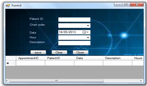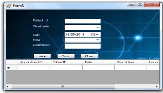 In appoitnment form the doctor give to patient new appointment with char order,date,hour and also write the descrpition.