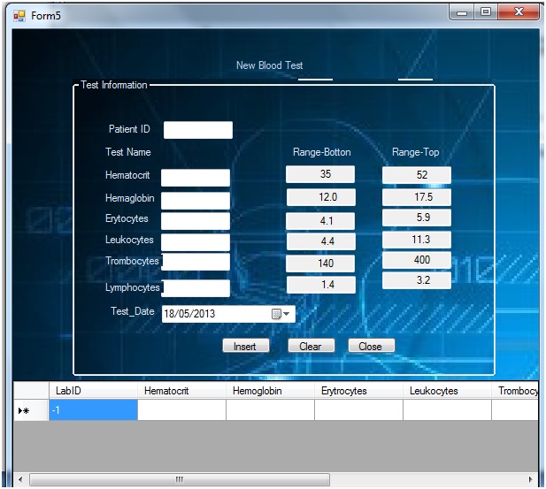If the Administrator have new blood test then move to add Lab result, in the next form will appear the table that are shown the equated of Range-Bottom and Range-Top of blood, the administrator need to fulfill the blood test result of patient with date results. The form is shown in figure 13.