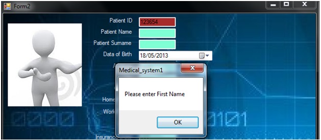 In this form the user has to write the patientID, name, surname, age and all there information about the new patient to have them in electronic way not in hard copy. This form I think is more important than the other form because it gives to administrator easy work, till now they have the patient information saved in hard copy but with this application they will have all patient in electronic way and this will help them to find the patient information easily.