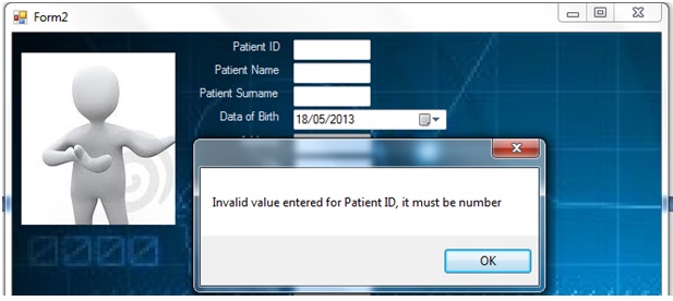 The other control that has been used is the one that doesn’t permit to put text at the textboxes that should contain numbers. In this case the following message will appear Figure 7.