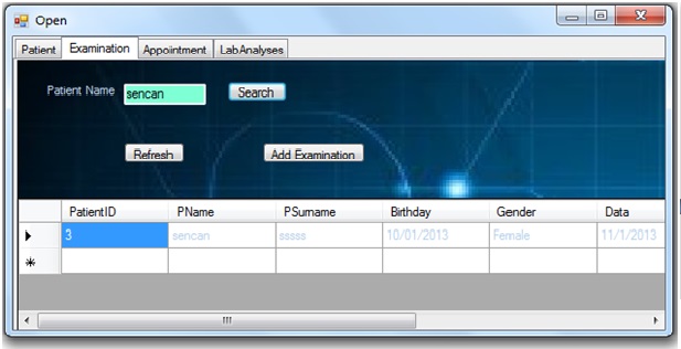 In the next form the main elements which are seen in the figure above are the tabs with their main properties Patient, Examination, Appointment and Lab Analysis, depending on the administration need from this form can choose them from this form to work.