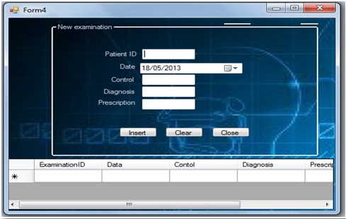 For adding new examination I create this form, in this forum the administrator have to write the patient ID for identification of patient then have to choose the date ,to write the control ,diagnosis and presentation than can insert the new examination. If the administrator adds new examination for patient form will appear the Figure 9.