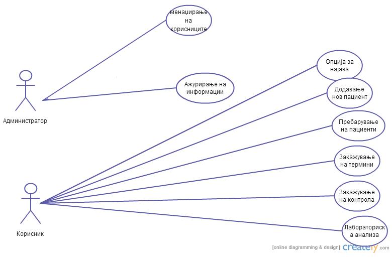 | Alternative Flows: | 1. Корисникот ја посетува страната 2. Потоа внесува податоци во полето за најавување 3. Корисникот е најавен 4. Коринскот оди во делот на апликацијата за контрола на пациентото 5. Корисникот мора про да му закаже термин за контрола на пациентото па потоа да ја изврши контролата 6. Пополнување на формата со потребните податоци за извршената контрола |