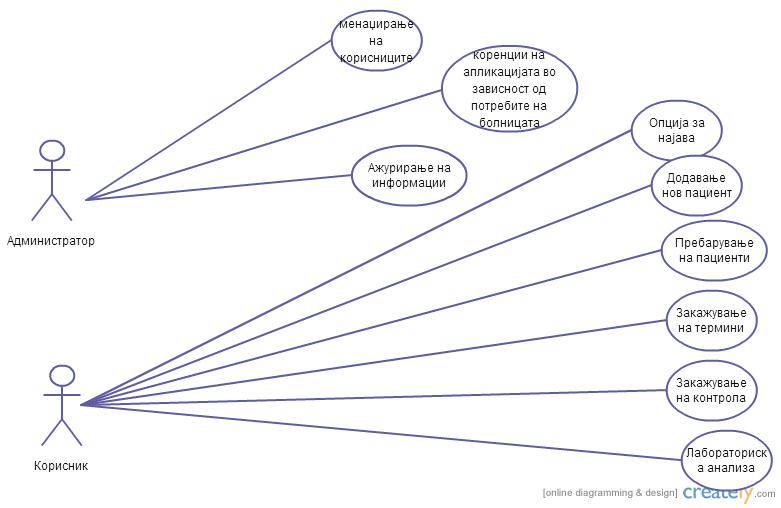 | Preconditions: | 1. Корисникот сака да ја користи дадената апликација за потребите на болницата |