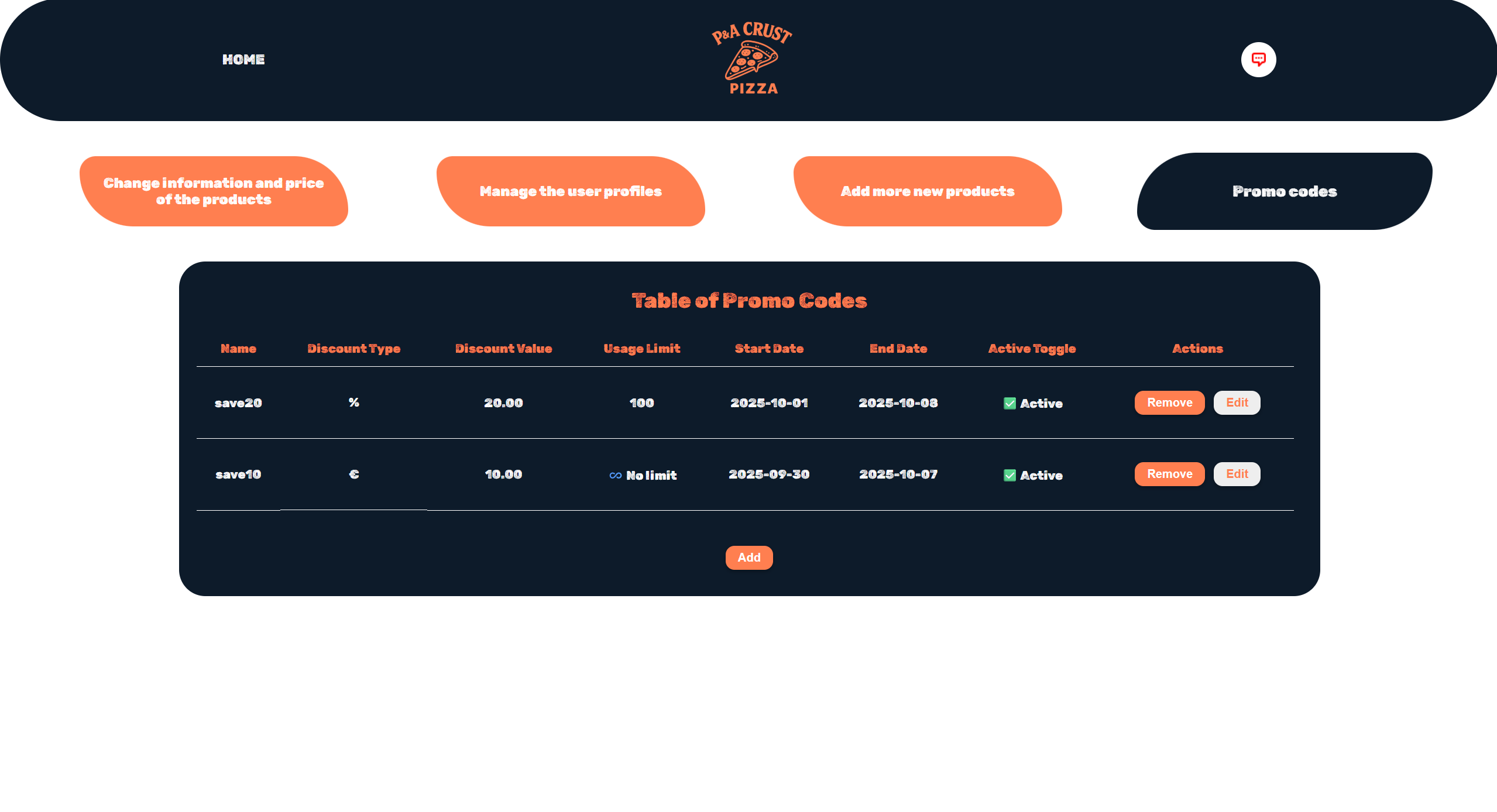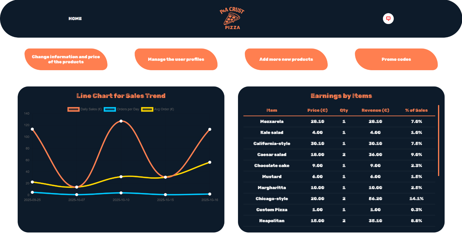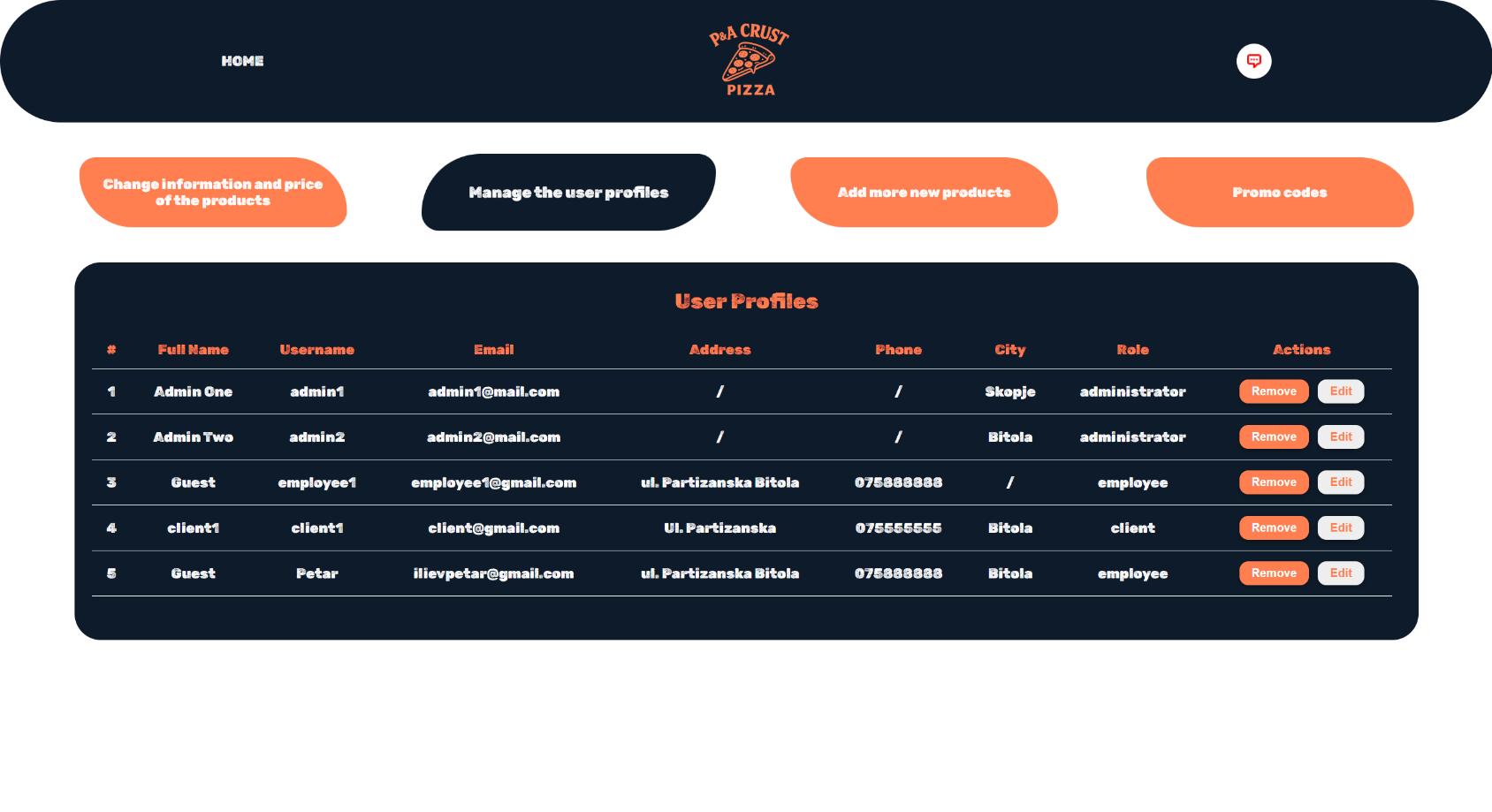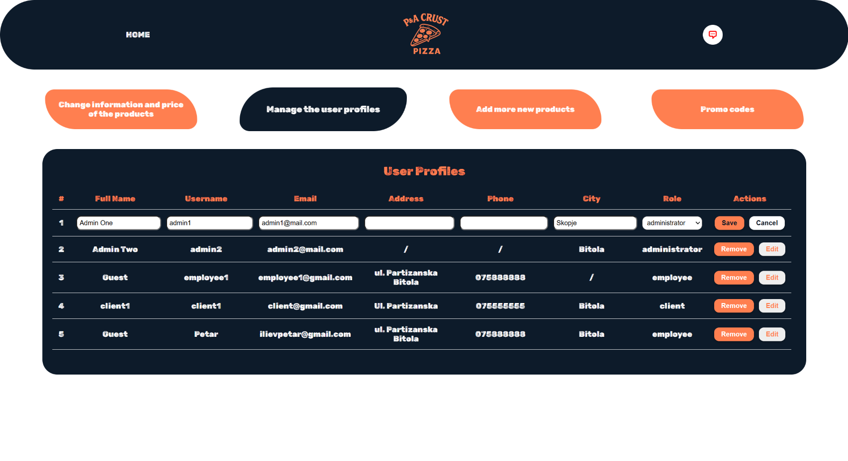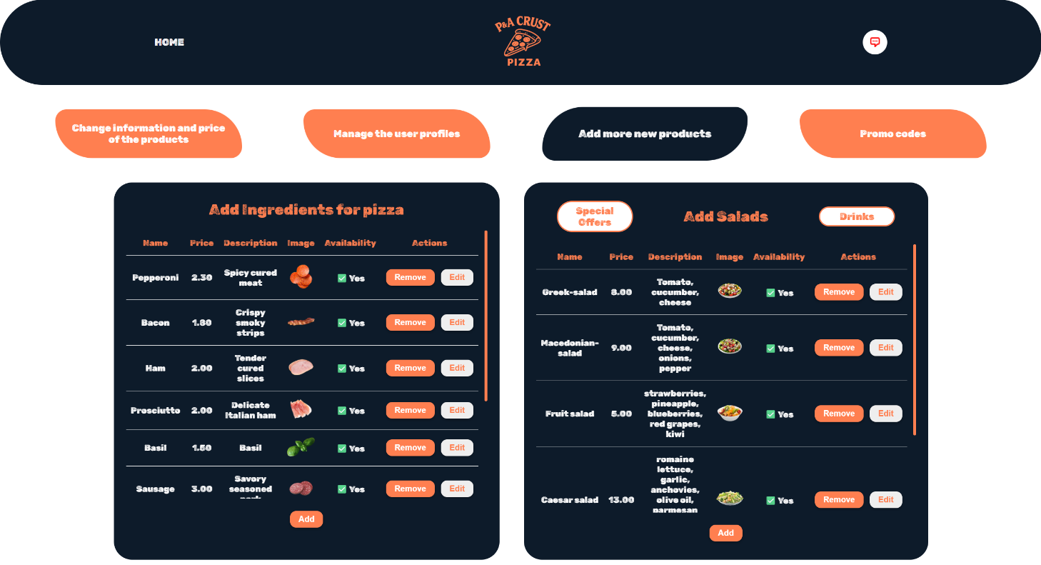 Други активности кои може да ги прави администраторот се менување на менито или на состојките во него. За додавање или менување на пиците од менито се клика Change information and price of the products.