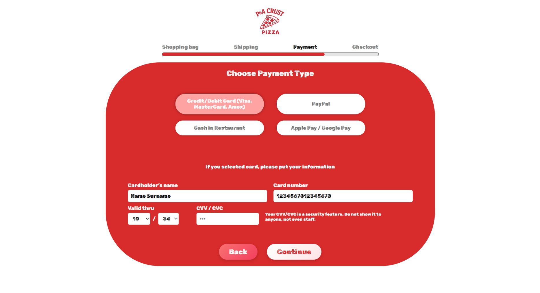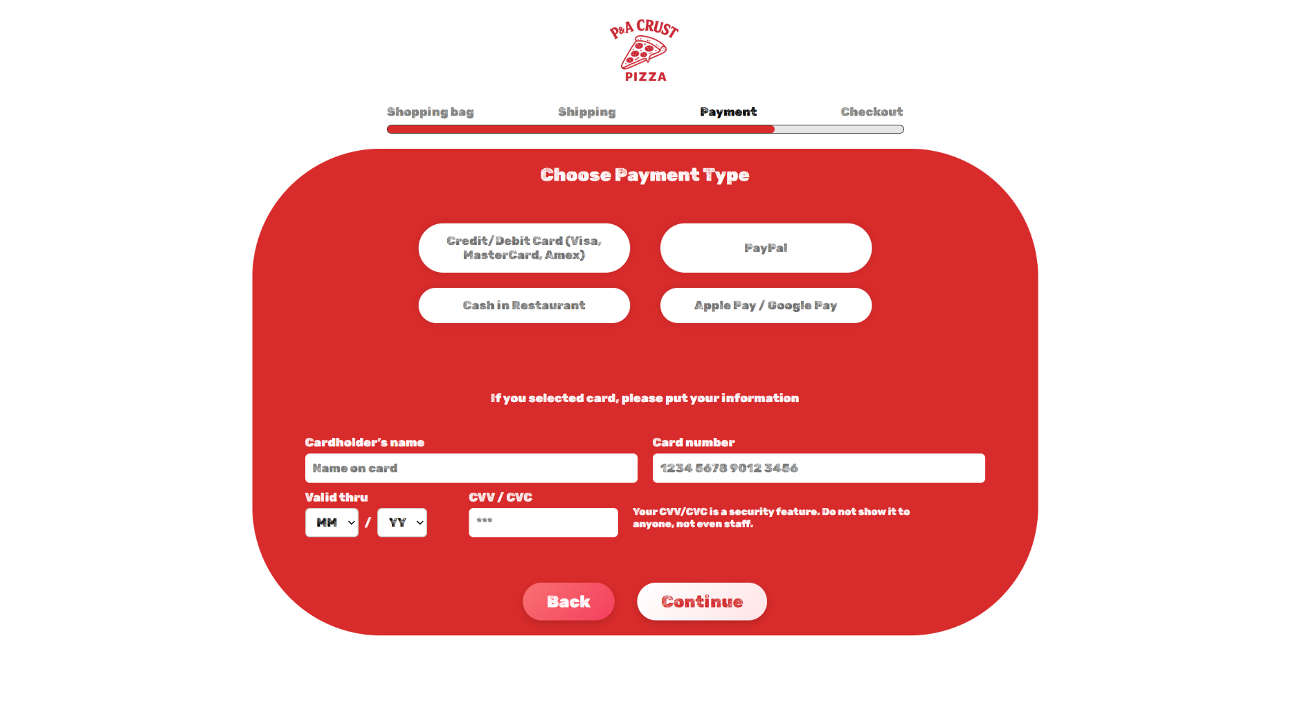 Следно корисникот е упатен кон Choose Payment Type, каде го избира начинот на плаќање и потоа доколку изборот е картичка ги внесува информациите за картичката.