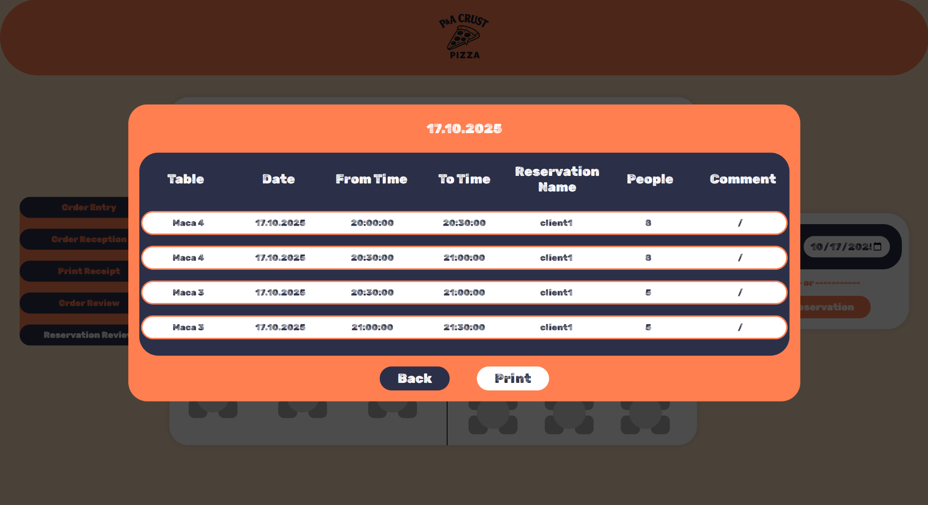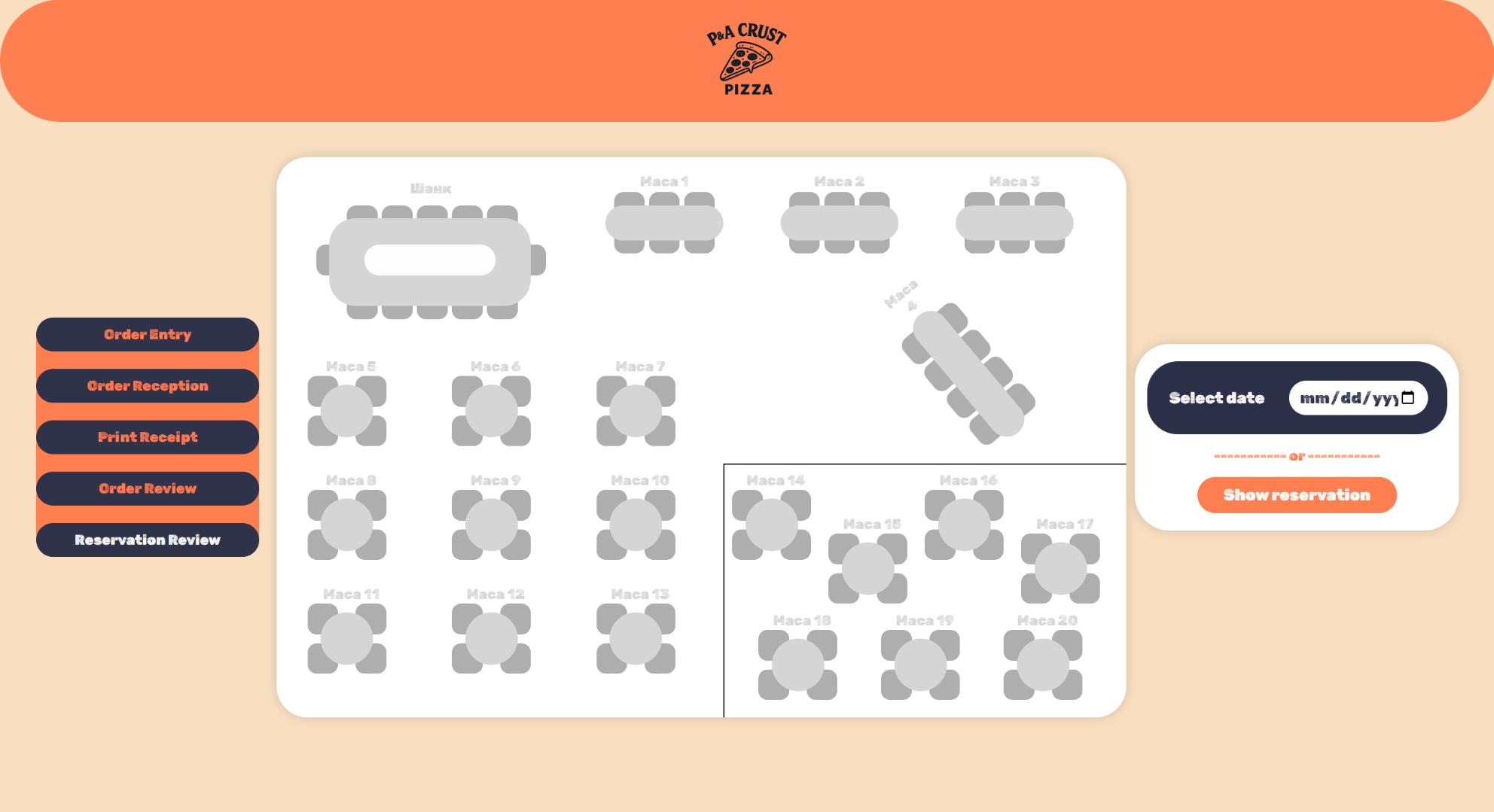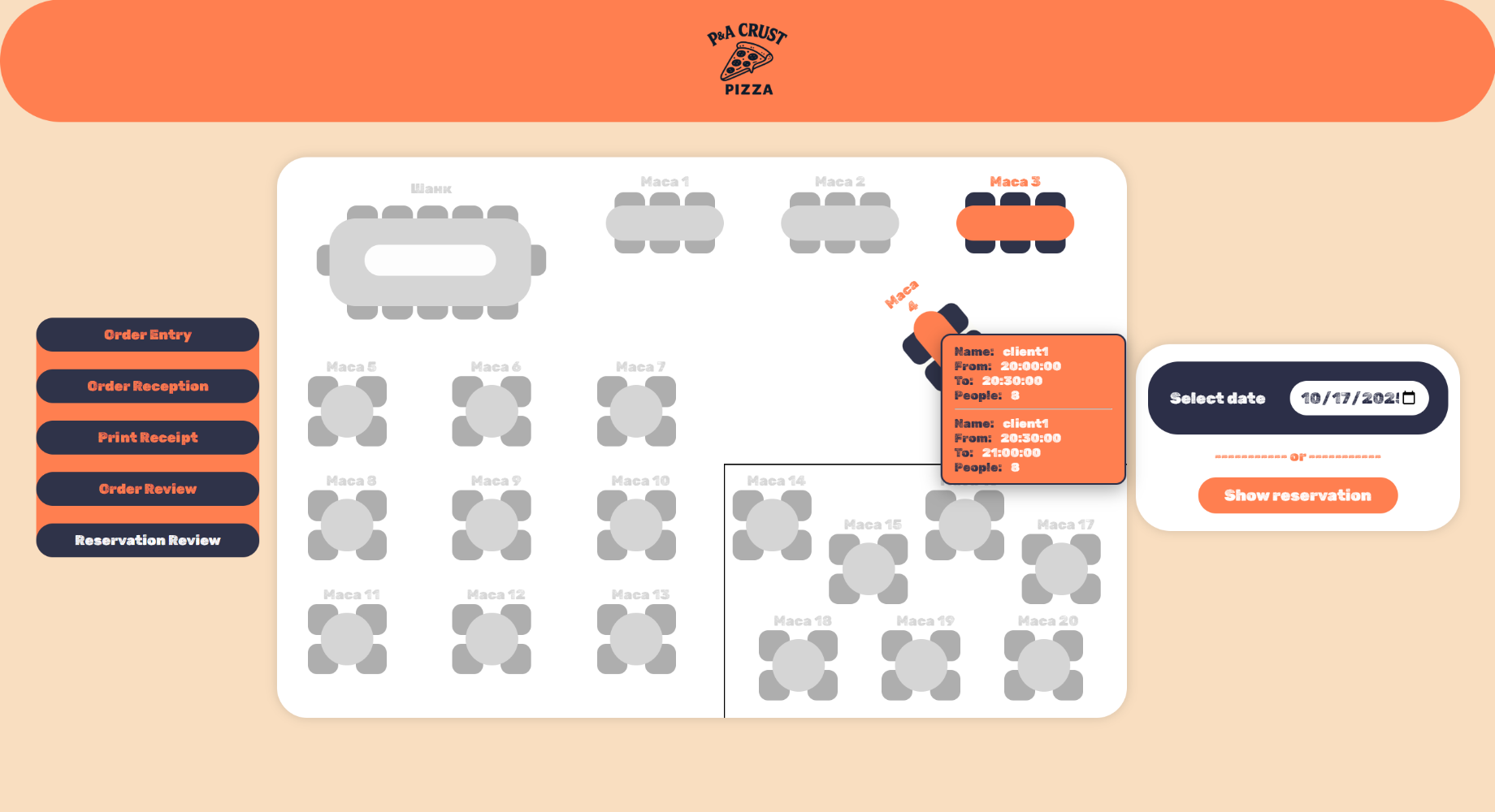 При што се селектира датумот и масите кои на тој ден имаат резервација ја менуваат бојата. Со hover на масите се покажуваат информации за таа маса.