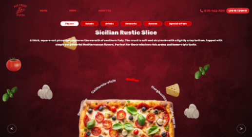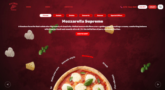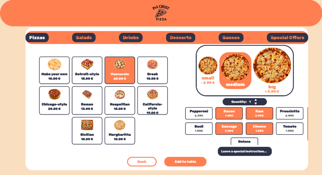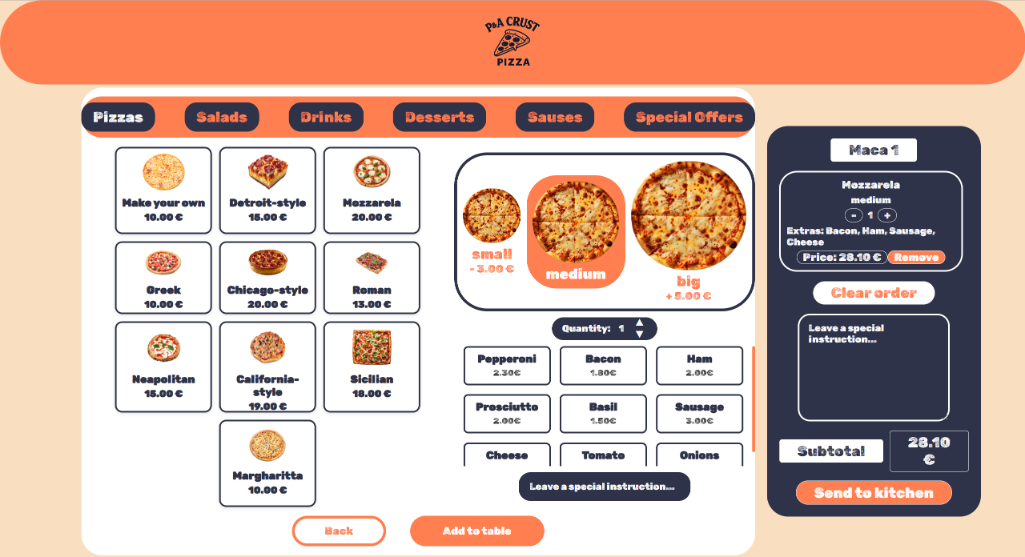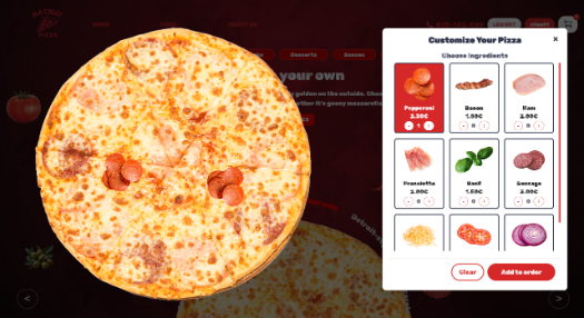 Потоа пицата се преместува на левата страна, по што корисникот може да одбере кои од состојките од десната страна сака да ги додаде, и потоа се клика на Add to order.