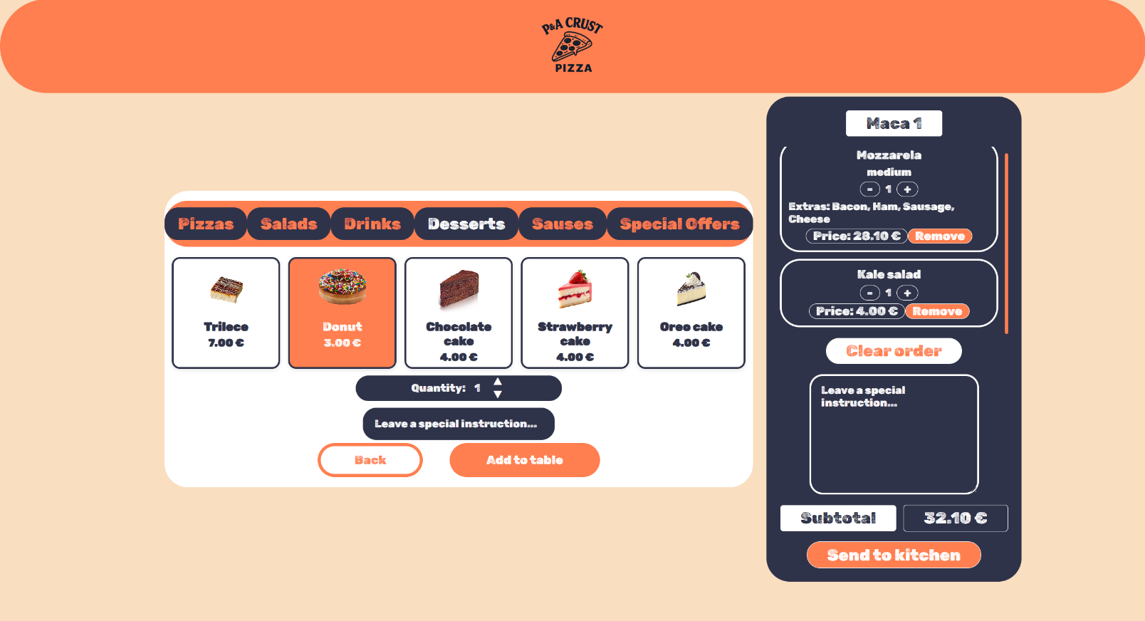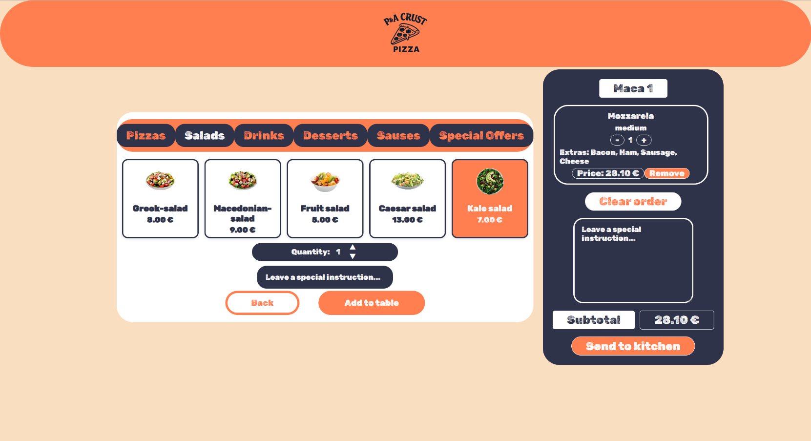 Со одбирање и кликање на Add to table, се отвара десниот дел со сите работи кои се додадени на масата и има копче Send to kitchen кое ја испраќа нарачката.