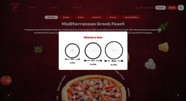 При избор на пицата, со клик на копчето Add to Cart кај пиците. Се одбира големината на пицата.