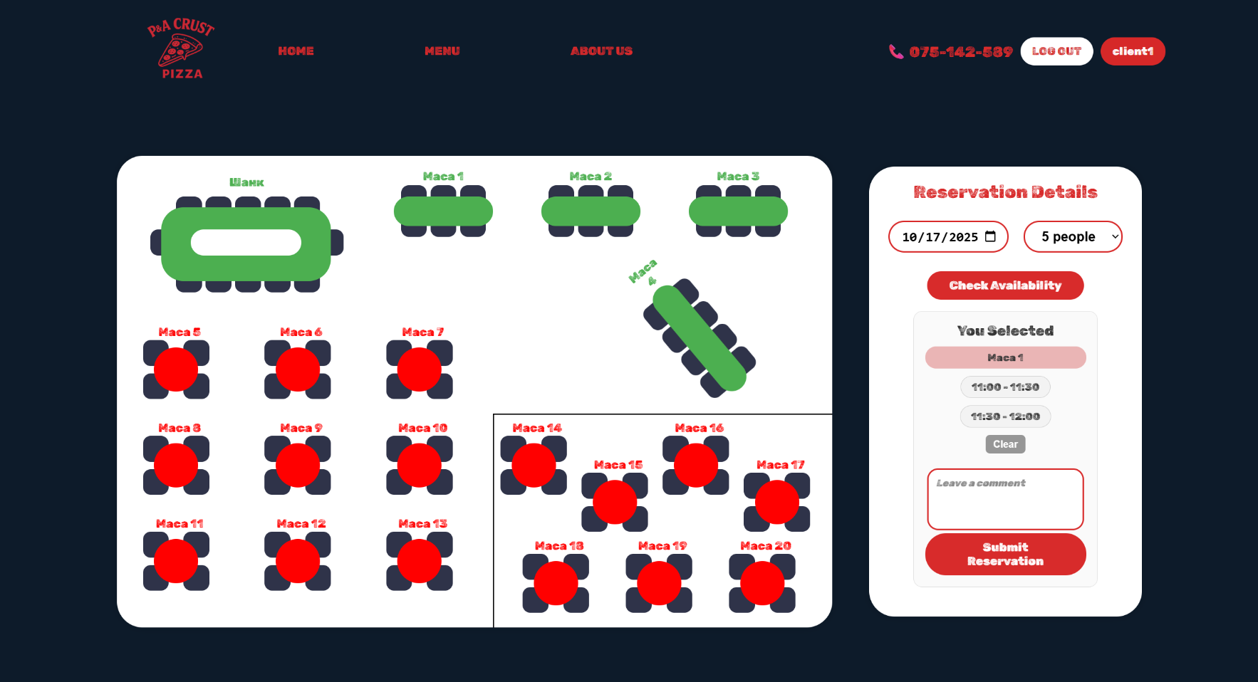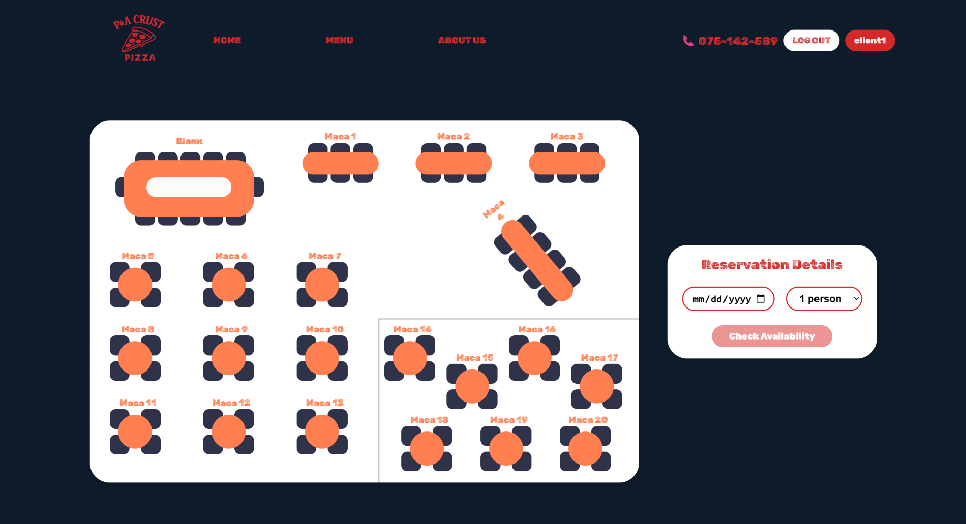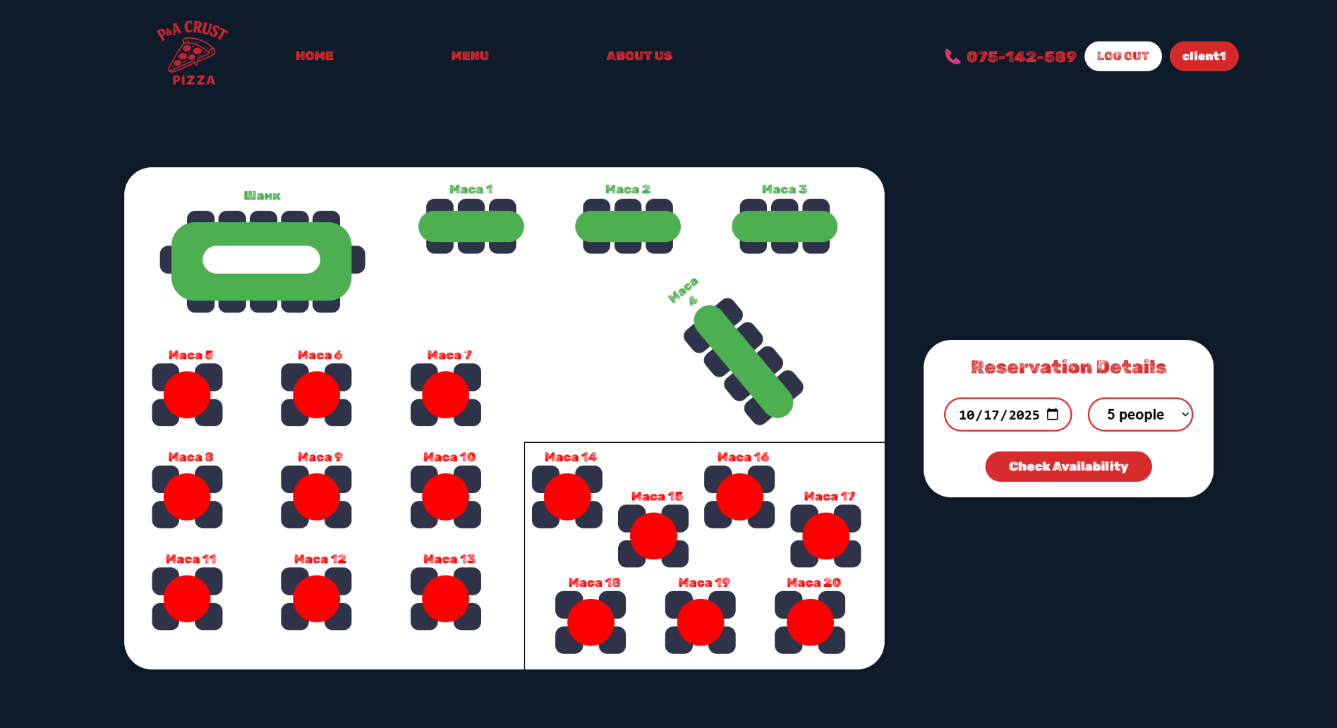 Откако ќе го избере датумот на резервација и бројот на лица, со клик на копчето Check Availability се прикажува достапноста на масите — достапните маси се обојуваат во зелена боја.