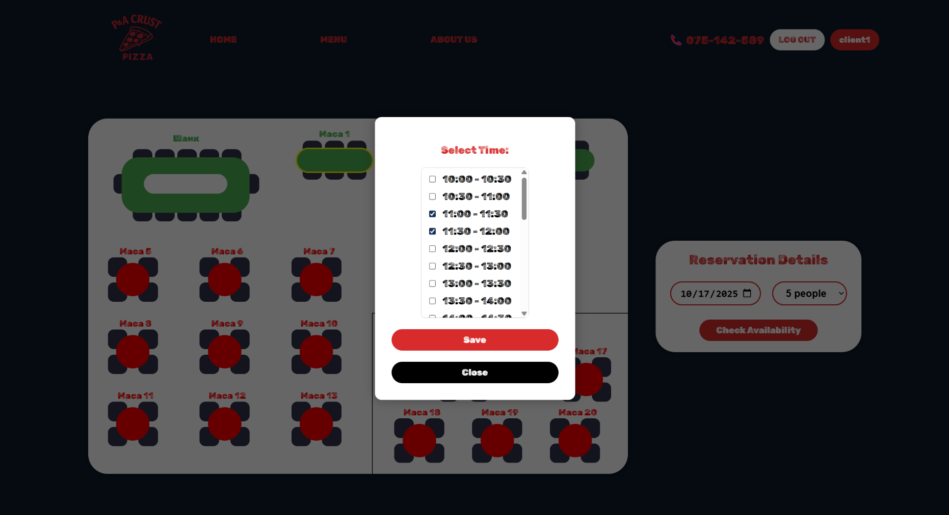 Со клик на една од зелените маси, корисникот може да го избере времетраењето на резервацијата (од кој до кој час) и да ја зачува со клик на Save.