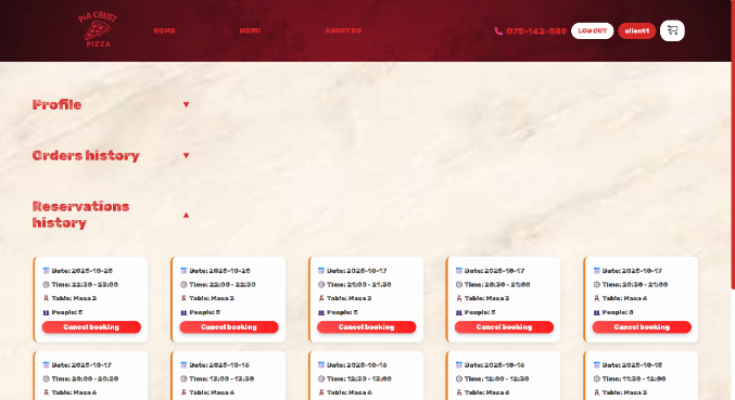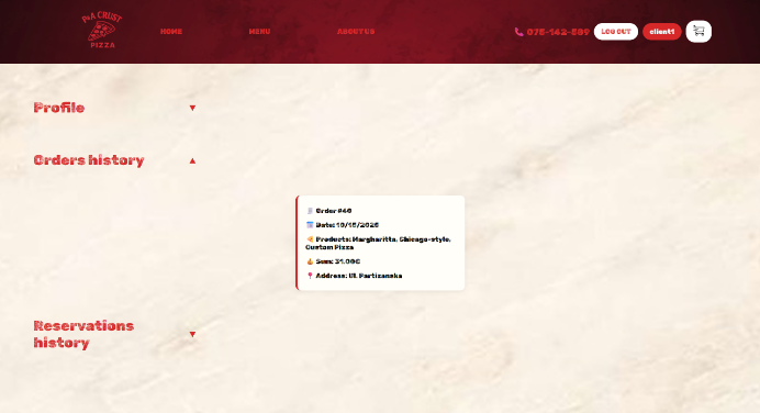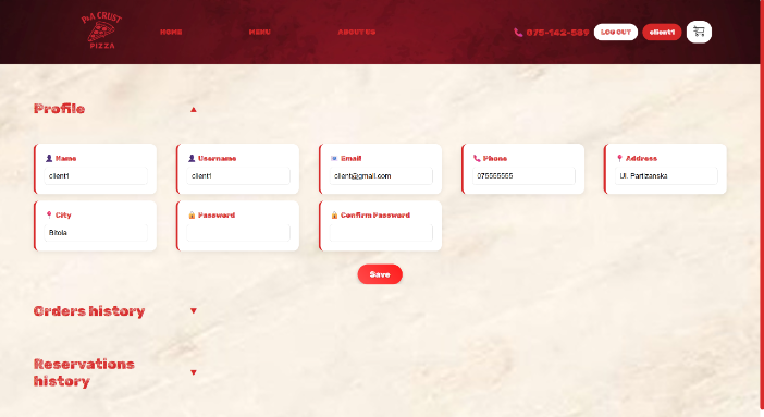 На почетната страница, доколку корисникот е најавен, може да пристапи до својот профил со клик на името во горниот десен дел. Таму се прикажани неговите информации за профилот, претходните нарачки и резервации.
