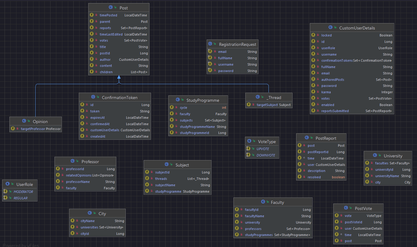 Истата зависи од неколку сервис класи кои содржат методи за валидација на примените податоци, како и од repository слојот. Вторава зависност е да се провери дали во базата постои корисник со ист e-mail (уникатна колона во случајов) и ако постои, дали сметката му е активирана. Во случајот да постои и да е активирана, се враќа исклучок со порака што се пропагира до UI слојот. Во спротивно, се инстанцира и перзистира во база објект од класата ConfirmationToken, со чиешто уникатно поле се гради линк за активација на сметката. Со помош на трета зависност - EmailSender класата (која повикува методи од JavaMail API) се испраќа мејл со линкот за активација, кој води до GET повик на кој се одзива confirm методот од RegistrationController, чијашто задача е да провери дали во базата постои токенот кој го добива како параметар. Доколку постои и е важечки (генериран пред доволно краток временски период), методот ја овозможува сметката и тоа го соопштува на UI слојот со враќање на стрингот „Confirmed“.