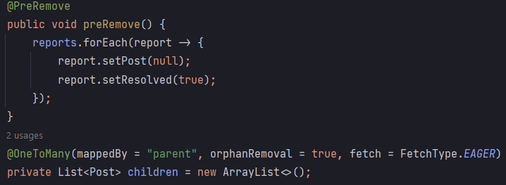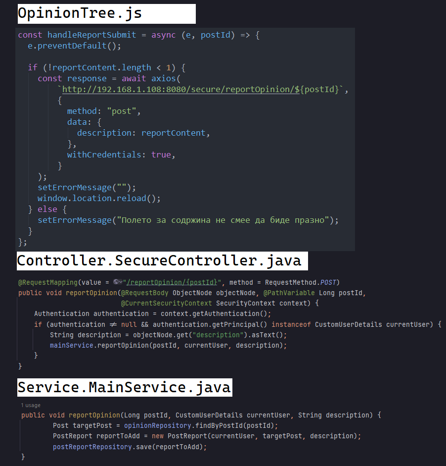 За бришење мислења во сервисниот слој се повикува PostRepository.deleteById(...), при што заедно со мислењето од базата се бришат сите негови „потомци-мислења“, а се зачувуваат пријавите за мислењето: