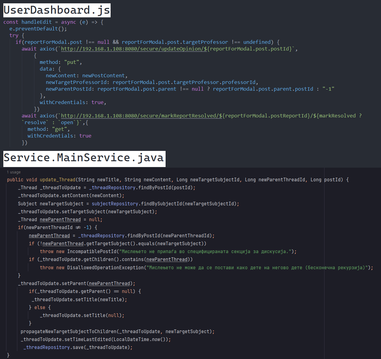 Како пример е даден само случајот за уредување мислења за предмети (Thread)