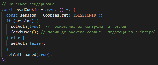 - доколку има, ја поставува глобалната променлива auth=true, што тригерира блокирачки повик кон fetchUser()