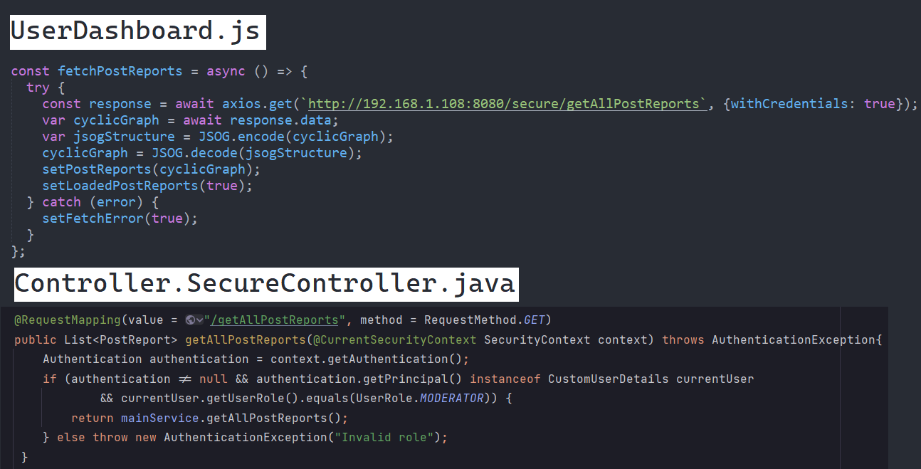 fetchPostReports() е метод кој се повикува при секое освежување на UserDashboard компонентата, но само доколку најавениот корисник ја има улогата 'MODERATOR'. За ова да се провери (поедноставено):
