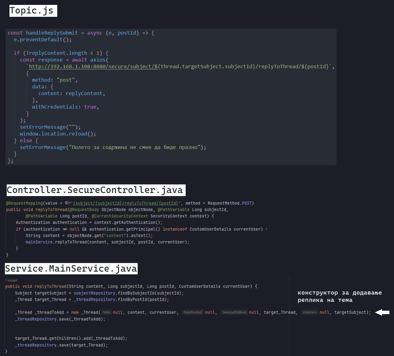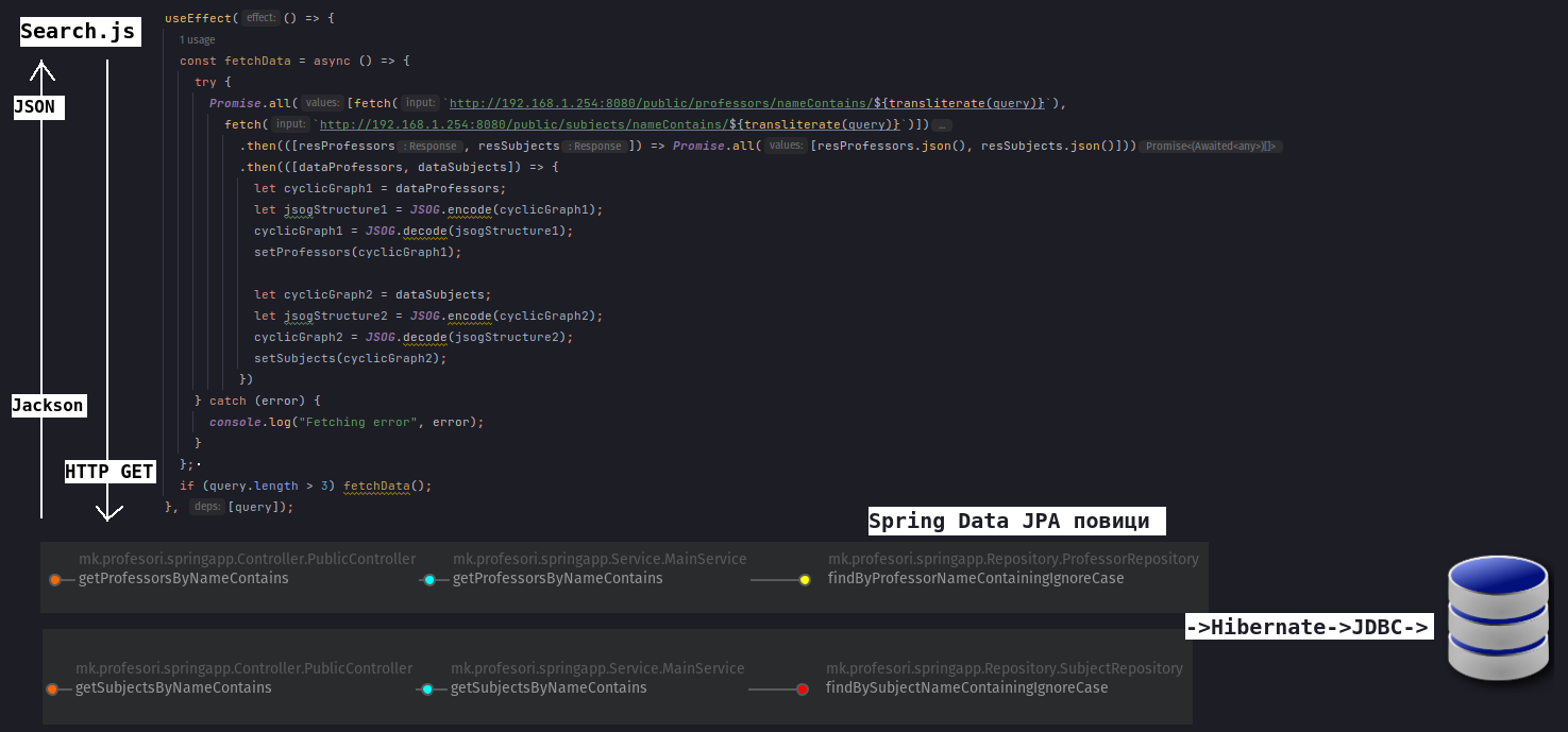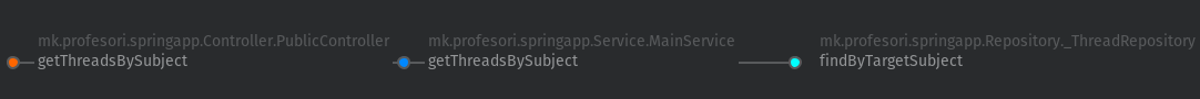 Истиот тек го следат повеќето делови од апликацијата. На пример, приказот на сите теми за даден предмет откако корисникот ќе се најде на страницата /subject/[subjectId], го спроведува компонентата Topic.js на сличен начин како погоре.