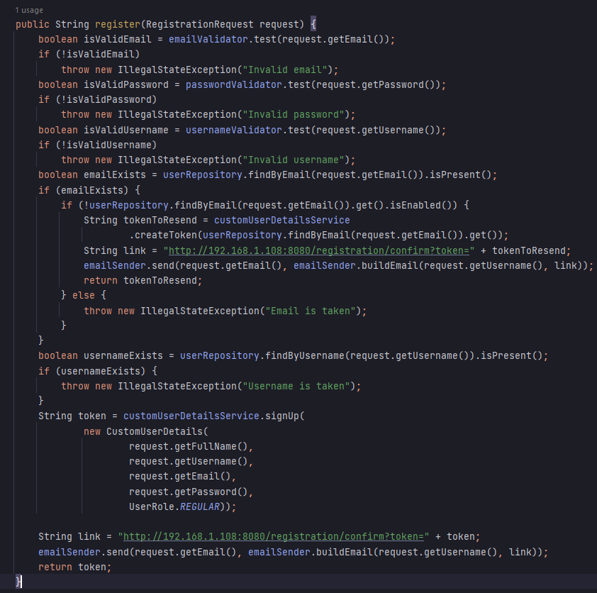 Главниот дел од логиката за корисничка регистрација се содржи во register методата од RegistrationService која се одзива на повик од RegistrationController и која прима податоци за новата корисничка сметка што треба да ја креира.