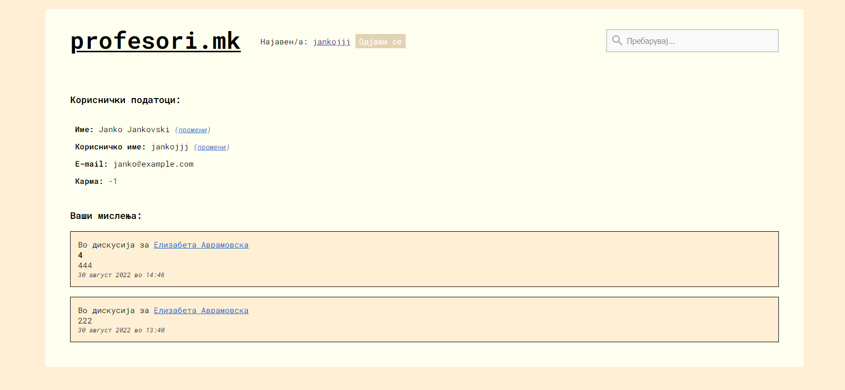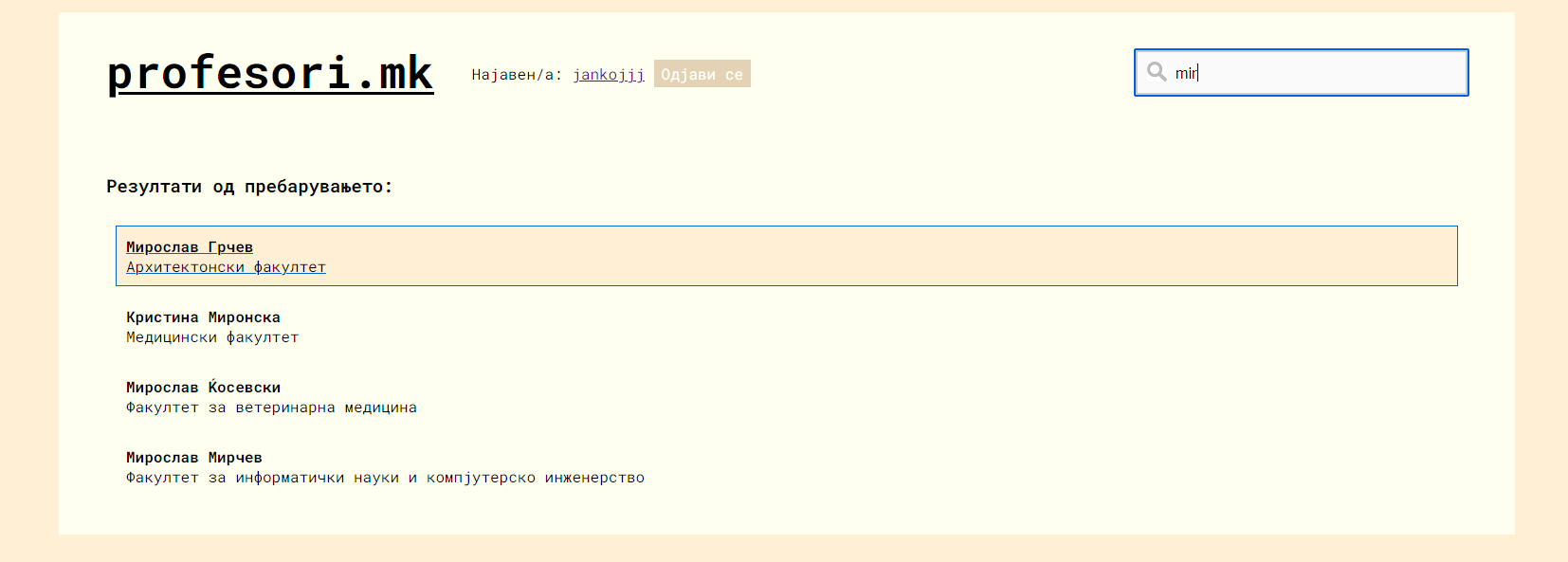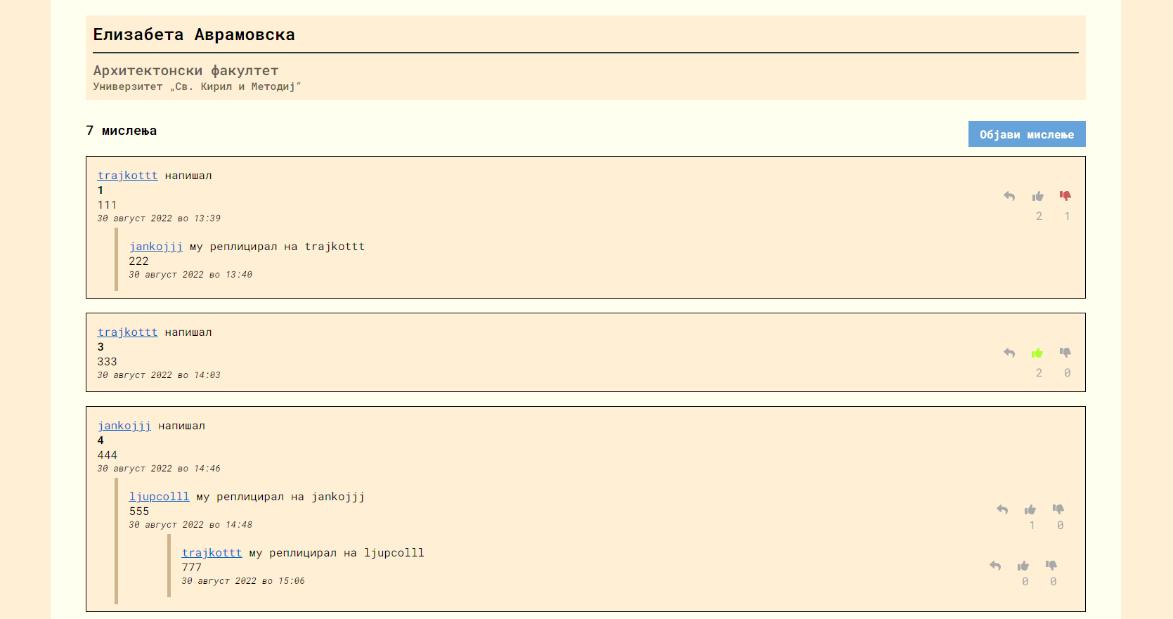 Доколку има најавен корисник, се прикажуваат и опции за објавување ново мислење, како и давање реплика, правење upvote или downvote на постоечко мислење, реализирани со соодветни повици, пр. "GET /secure/professor/[professorId]/upvoteOpinion/[opinionId]".