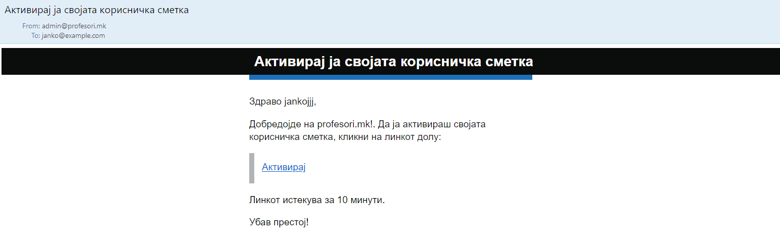 По овој чекор корисникот е внесен во базата, но неговата сметка сè уште не е активирана (има знаменце enabled==false) и не може да се најави. За таа цел, со помош на библиотеката Java Mail се испраќа email до наведената адреса со линк што содржи уникатен токен за потврда со ограничено времетраење. Линкот води до GET повик до позадината (/registration/confirm?token=[TOKEN]) кој ја активира сметката.