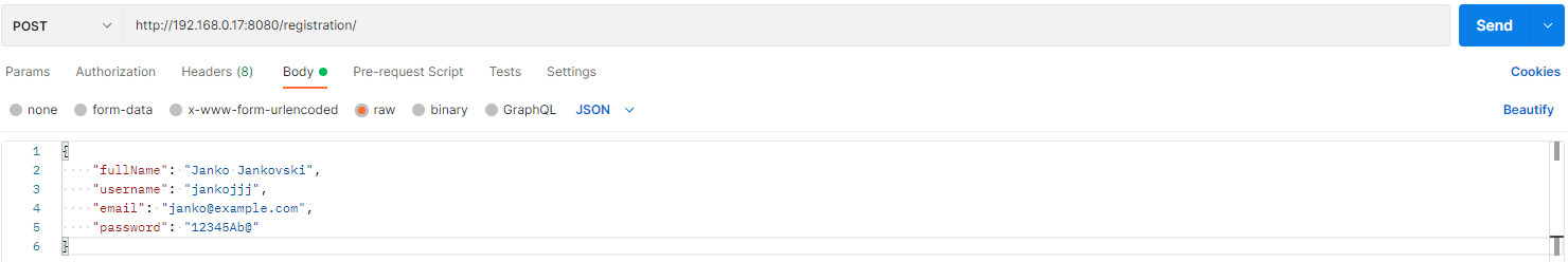 Во оваа фаза за регистрацијата на корисник нема интерфејс, но може да се изврши со POST повик до позадински сервис. Пример за валиден повик: