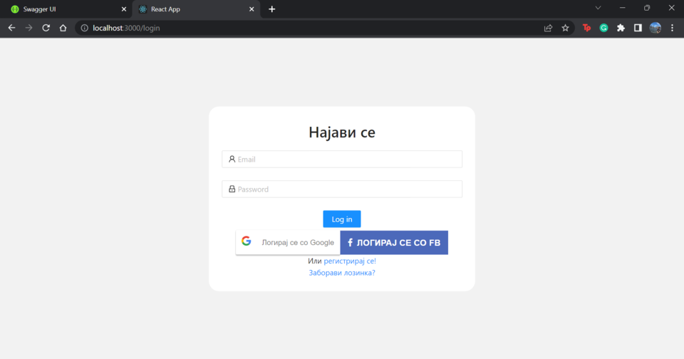 Имплементирана е автентикација со Google и Facebook при што секој корисник ќе може да се најави со било кој од овие методи (или емаил) и ќе има пристап до истиот профил