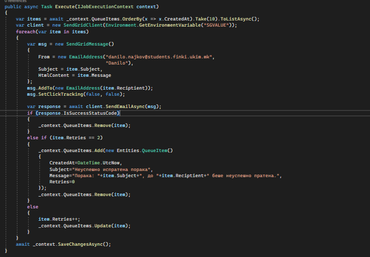 При праќање на емаил, известувањето се зачувува во ред на чекање. На секоја минута се праќаат 10 известувања. Ако известувањето е неуспешно 3 пати, се брише од редицата и се известува администраторот