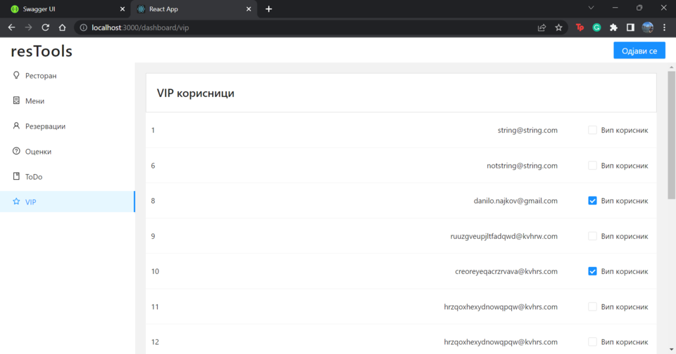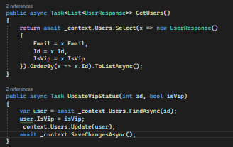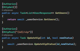 За оваа цел додадени се дополнителни методи во контролерот за корисници за преземање на сите корисници и доделување VIP статус