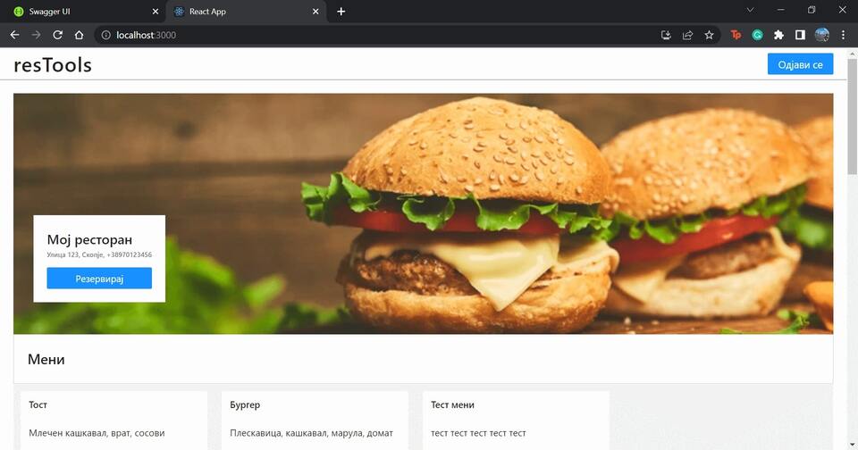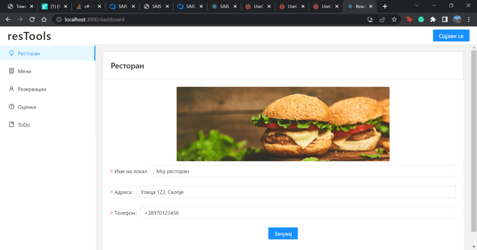 Админот оди на /dashboard страната во табот за Ресторан. Тука може да ја промени сликата, името, адресата и контакт телефонот на ресторанот