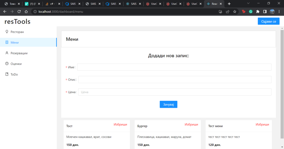 Админот оди на /dashboard страната во табот за Мени. Тука може да додаде нова ставка или да избрише стара