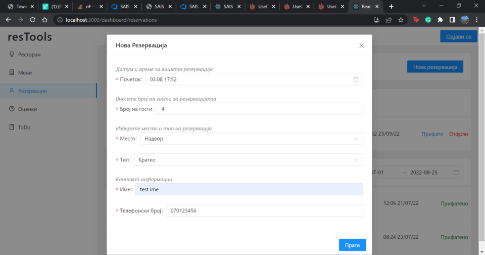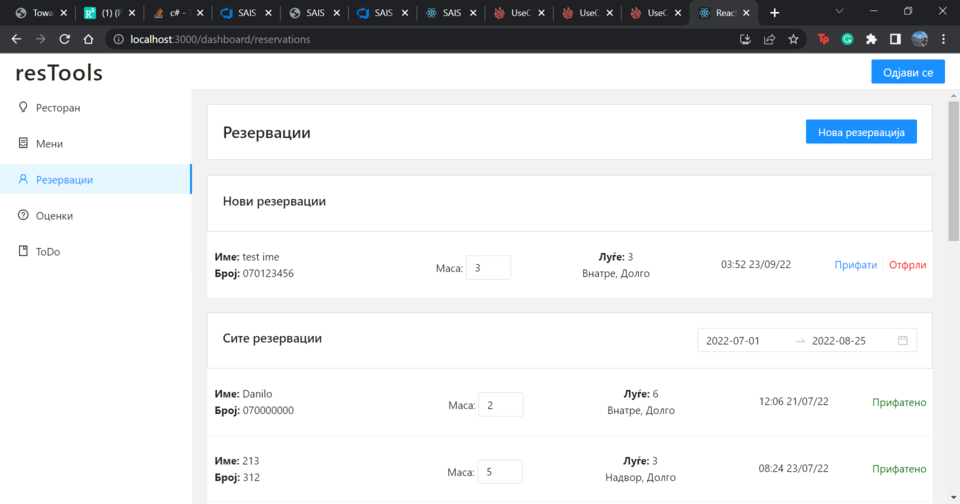 Админот оди на /dashboard страната во табот за Резервации. Тука може да ги види сите нови резервации или да сортира според време. Дополнително може да прифати или одбие резервација и да додели маса.