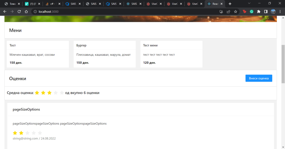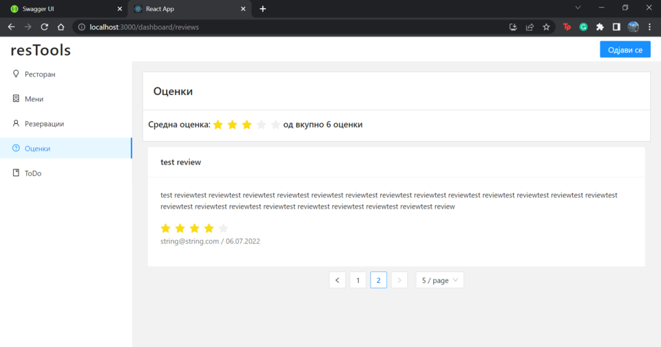 Админот оди на /dashboard страната во табот за Оценки. Тука може да ги разгледува сите оставени оценки од страна на корисниците. За оценките е имплементирано страничење